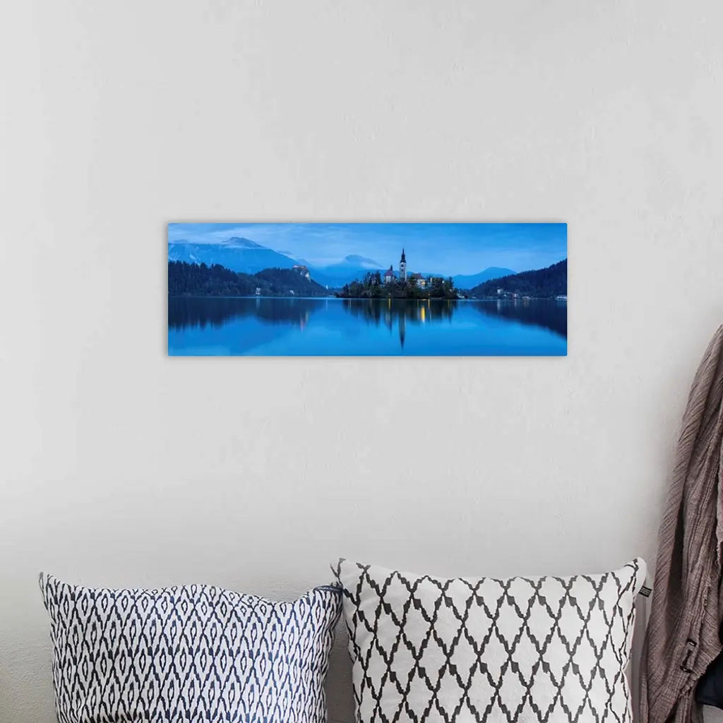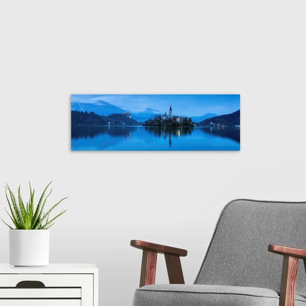 Slovenia, Upper Carniola, Julian Alps, Triglav National Park, Bled, Bled Island with the Church of the Assumption and Bled Castle in the background at dusk.