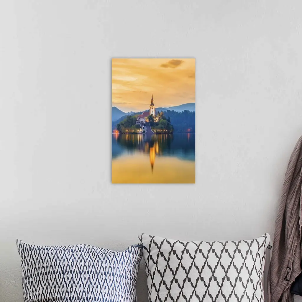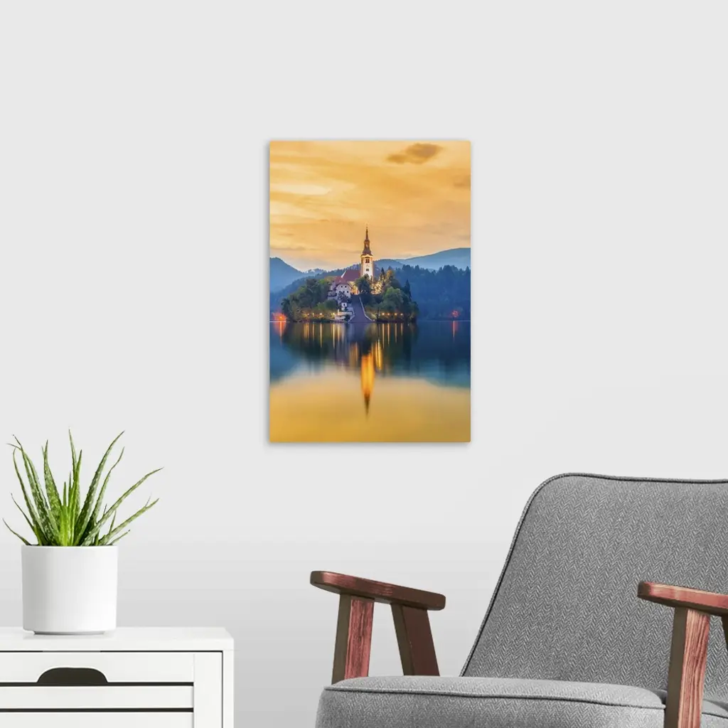Slovenia, Julian Alps, Upper Carniola, Bled, Lake Bled, Bled Island (Blejski otok) with Church of the Assumption (Cerkev Marijinega vnebovzetja)