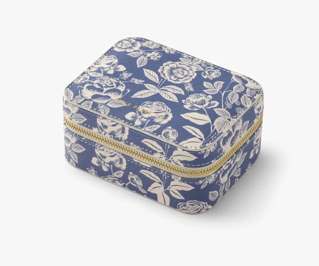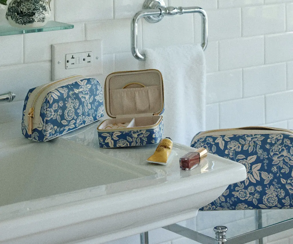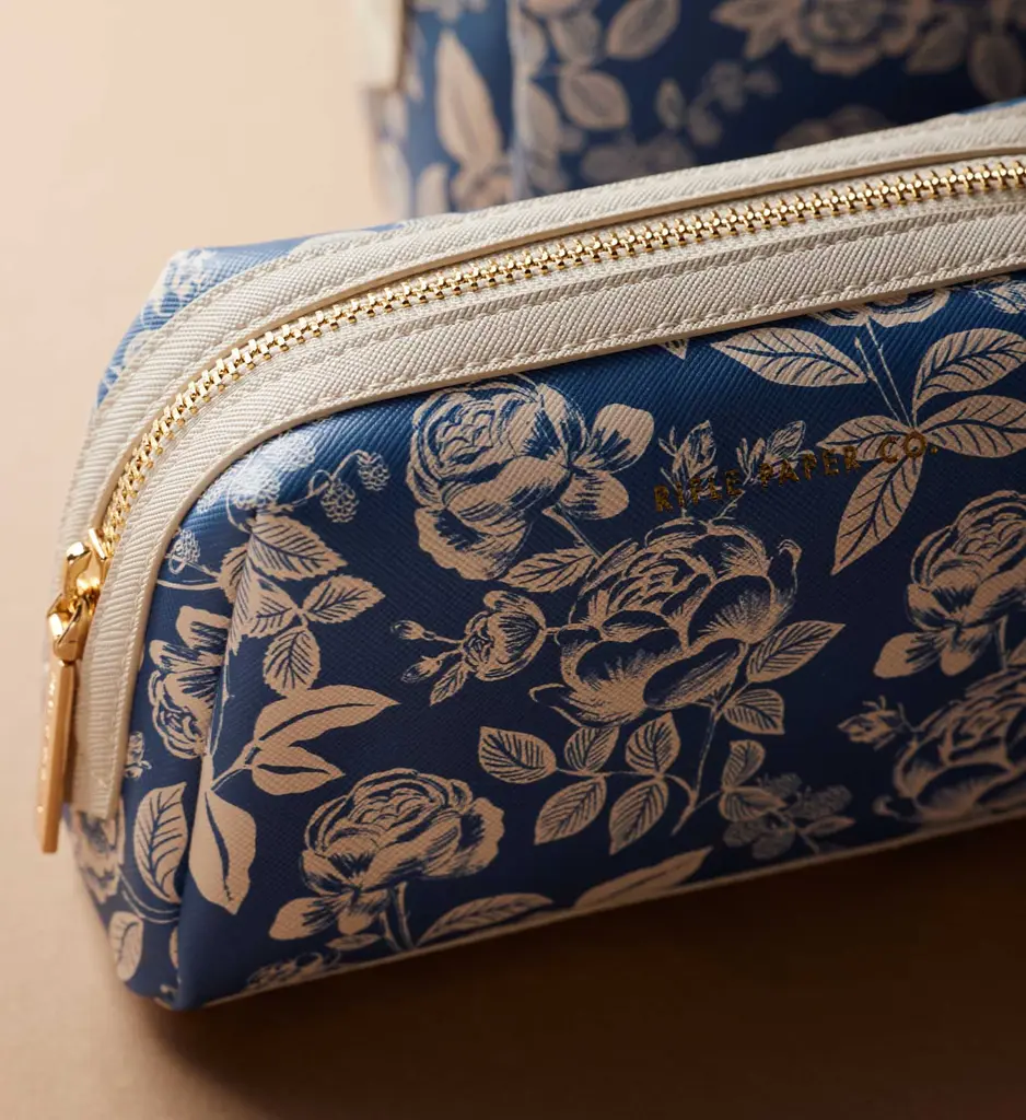 Tuck away cosmetics, toiletries, or brushes at home or while you travel in our English Rose small cosmetic pouch. Made from a structured material with a textured finish and a wipe-clean lining, it will hold up to everyday use. A wide opening makes it easy to see what's inside, and the brass zipper and pull add a perfect finishing touch.