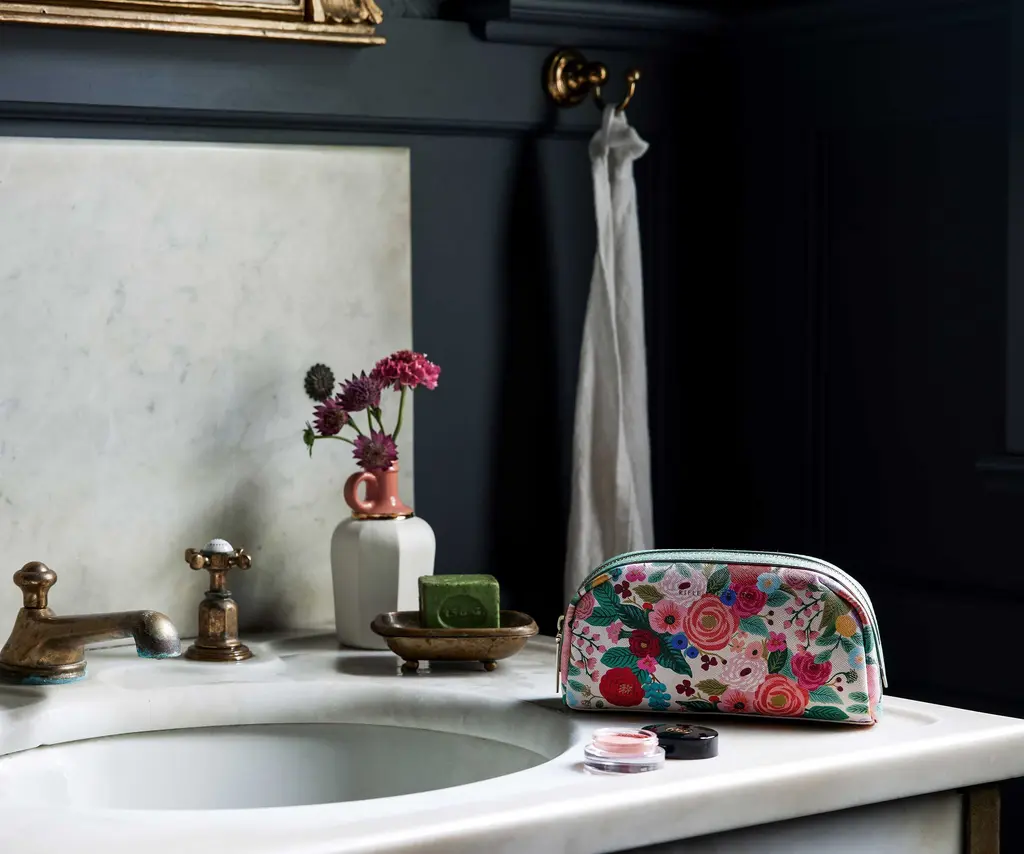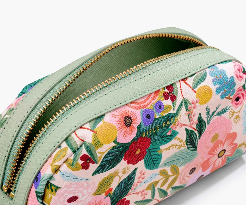 Tuck away cosmetics, toiletries, or brushes at home or while you travel in our Garden Party small cosmetic pouch. Made from a structured material with a textured finish and a wipe-clean lining, it will hold up to everyday use. A wide opening makes it easy to see what's inside, and the brass zipper and pull add a perfect finishing touch.