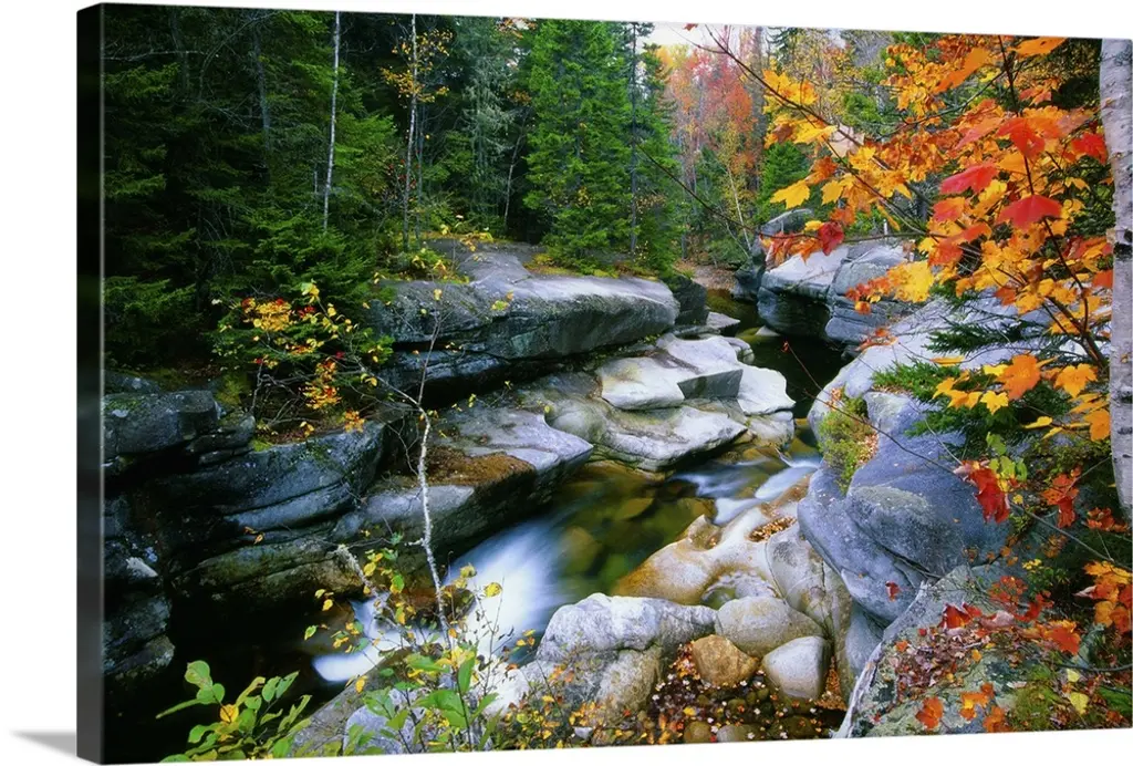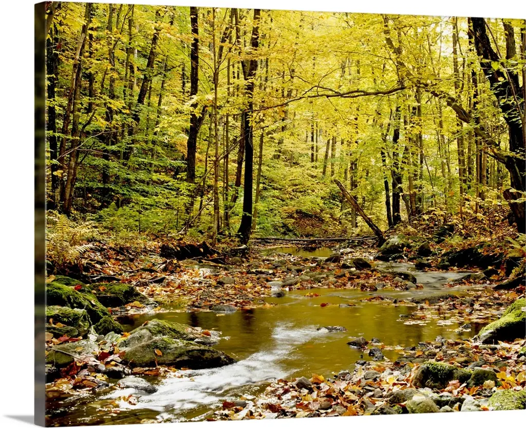 A narrow stream rushes through the woods in this landscape photograph.