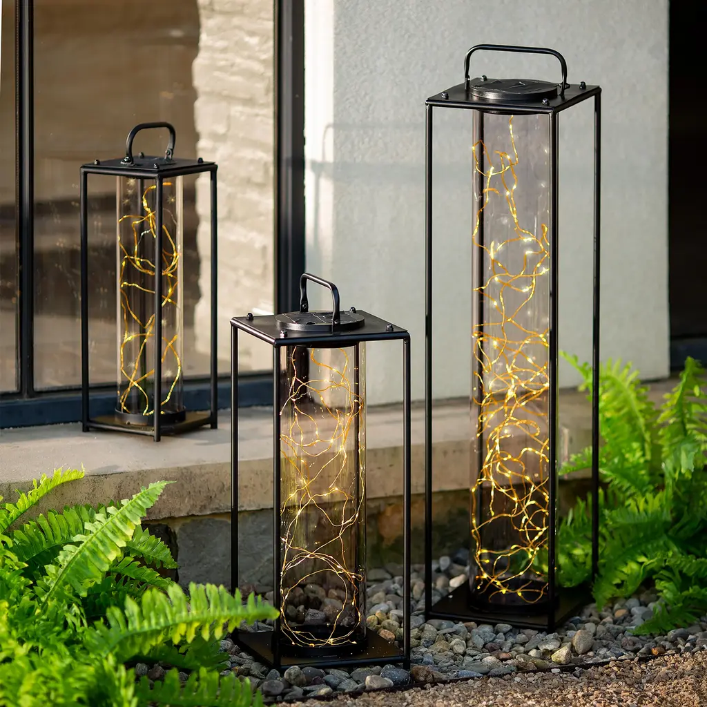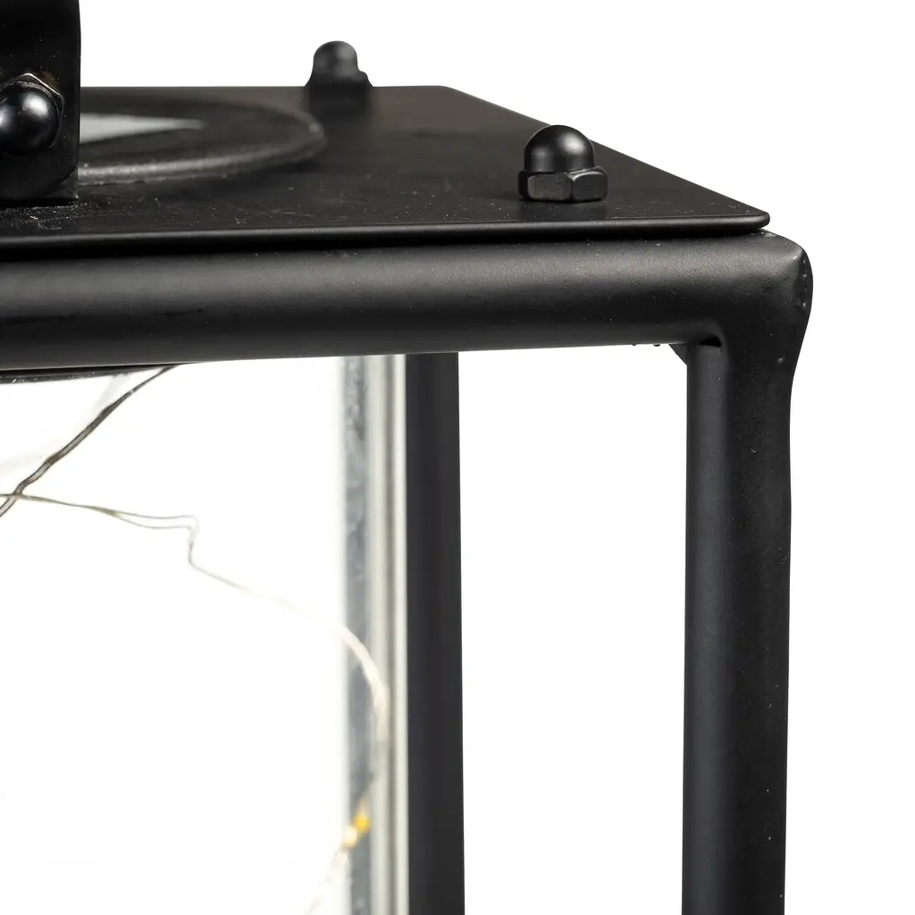 This modern Firefly Solar-Lighted Lantern creates a dazzling and luminous look for your deck, porch, or sunroom. Set it on a table, on the floor, patio, or hang it. LED micro-lights charge in the daylight and light up with a warm glow after dark. Made of corrosion-resistant iron and sturdy tempered glass, each piece will retain its masterfully handcrafted appearance for years. With its classic, sturdy body in a traditional black or white finish and its modern solar technology, the Firefly Solar-Lighted Lantern is a perfect, versatile outdoor accent. Perfect for home, weddings, churches, restaurants, and events. On/off switch, 6-hour light.