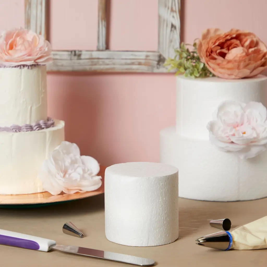 Perfect for creating cake displays and practicing cake decorating. This lightweight white foam cake dummy is ready to be customized! Decorate this cake dummy set using frosting, fondant, modeling paste, buttercream, chocolate, and flowers, your imagination is the limit! Ideal for any special occasion including weddings, birthdays, anniversaries, and holidays. This small-tiered dummy measures a total of 10.8 inches tall.