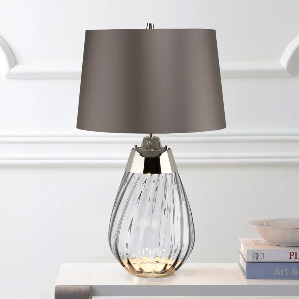 Small wavy textured blown glass table lamp with a Blue tint and Polished Nickel metalwork. This dual-lit table lamp has a 4-way switch to light both the shade and the base. Includes a Slate satin shade with matte silver laminate lining