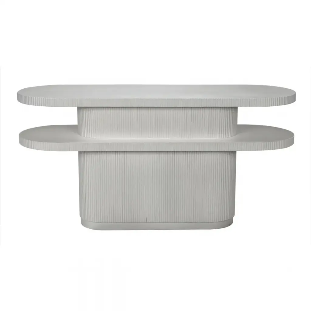 A dazzling display of design virtuosity, the artisan crafted Small Parker Console features mahogany and verneer that is finished in white wash. This chic design makes any room look sleek and modern.