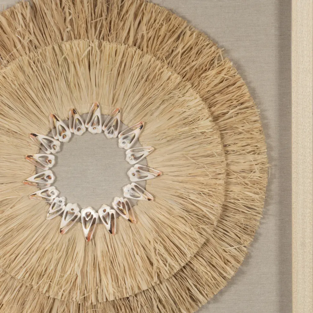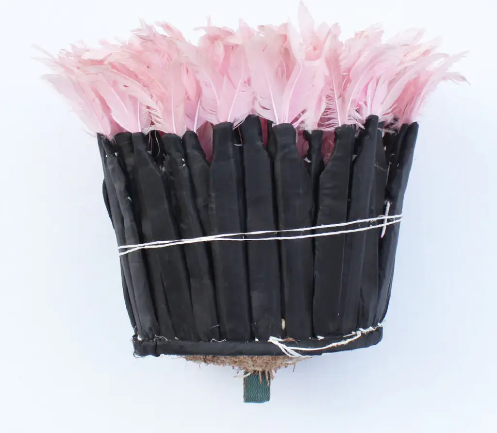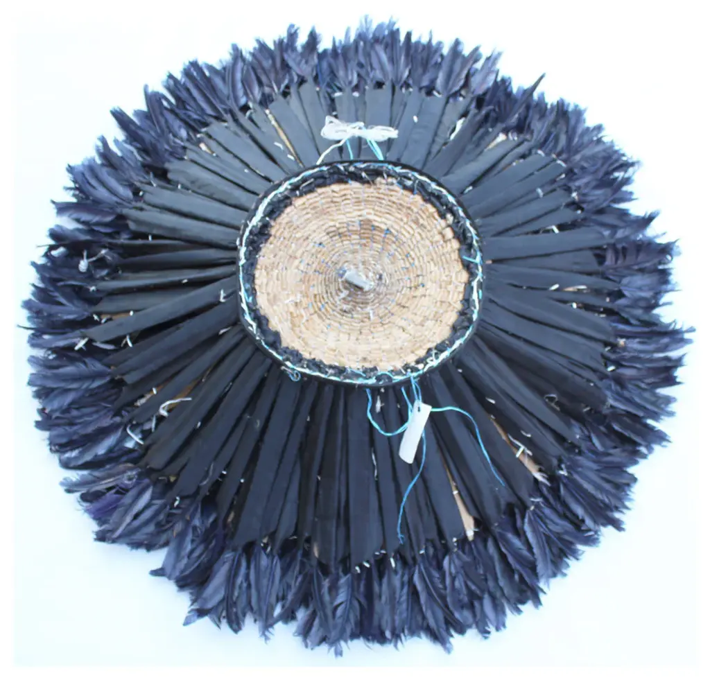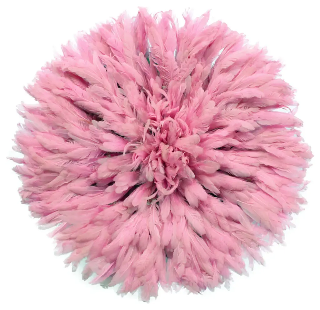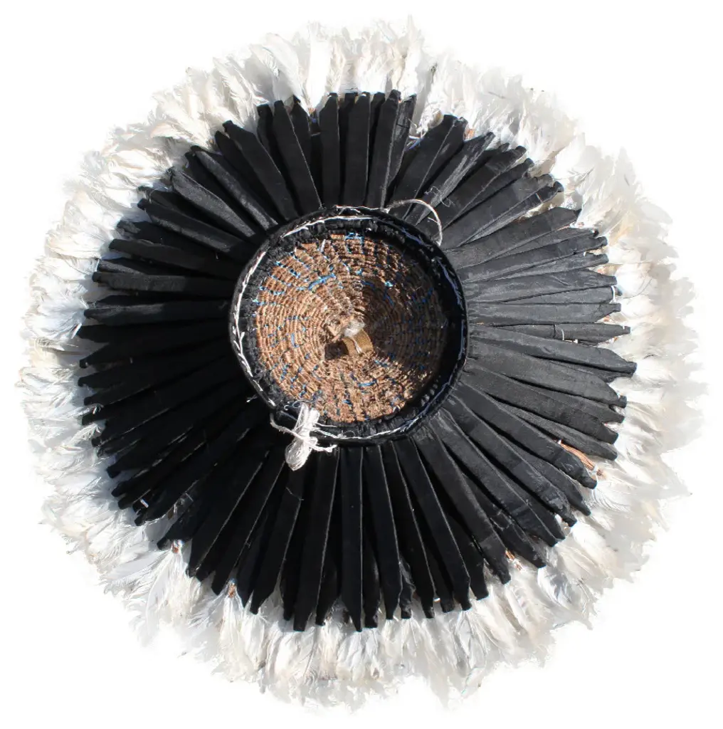 Origin: CameroonDimension: 23-25 inches/59-64 cm diameter.Profile dimension from wall surface (when open and suspend): approx. 4 inches (10 cm).Colors may differ slightly from photos due to different monitor settings. Also, the color may vary from one product to another due to the dye on feathers.Materials: Raffia wood, Hens feathers, fabric, plastic string, dyes for color.Imported. All Juju Hats have been fumigated before importation.Maintenance: Juju Hats need some love too. To maintain a beautiful Juju a little maintenance is necessary. Spray the feathers every 3 to 4 months with an anti-moth to prevent from any damages caused by insects. To remove the dust on the Juju, use a hair blow dryer on low temperature. Keep blow dryer at least 12 inches (or 30 cm) away from the feathers. If needed rearrange the feathers with your fingers.This artful Juju Hat, the Tyn Hat was handcrafted in Cameroon. For centuries, Bamiléké tribes have been making those hats that symbolize prosperity and freedom. Once, Juju Hats were worn by medicine men and royalties during tribal ceremonies. Nowadays, their customs are less restricted during Bamiléké traditional rituals and their beauty has reached homes beyond Cameroon"™s borders. Those headdresses are very impressive hung on walls. Juju hats are made from natural or dyed feathers and woven raffia. Artisans take 2 to 3 days to complete one hat.