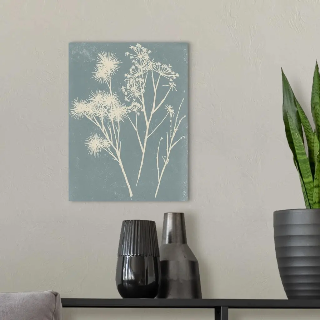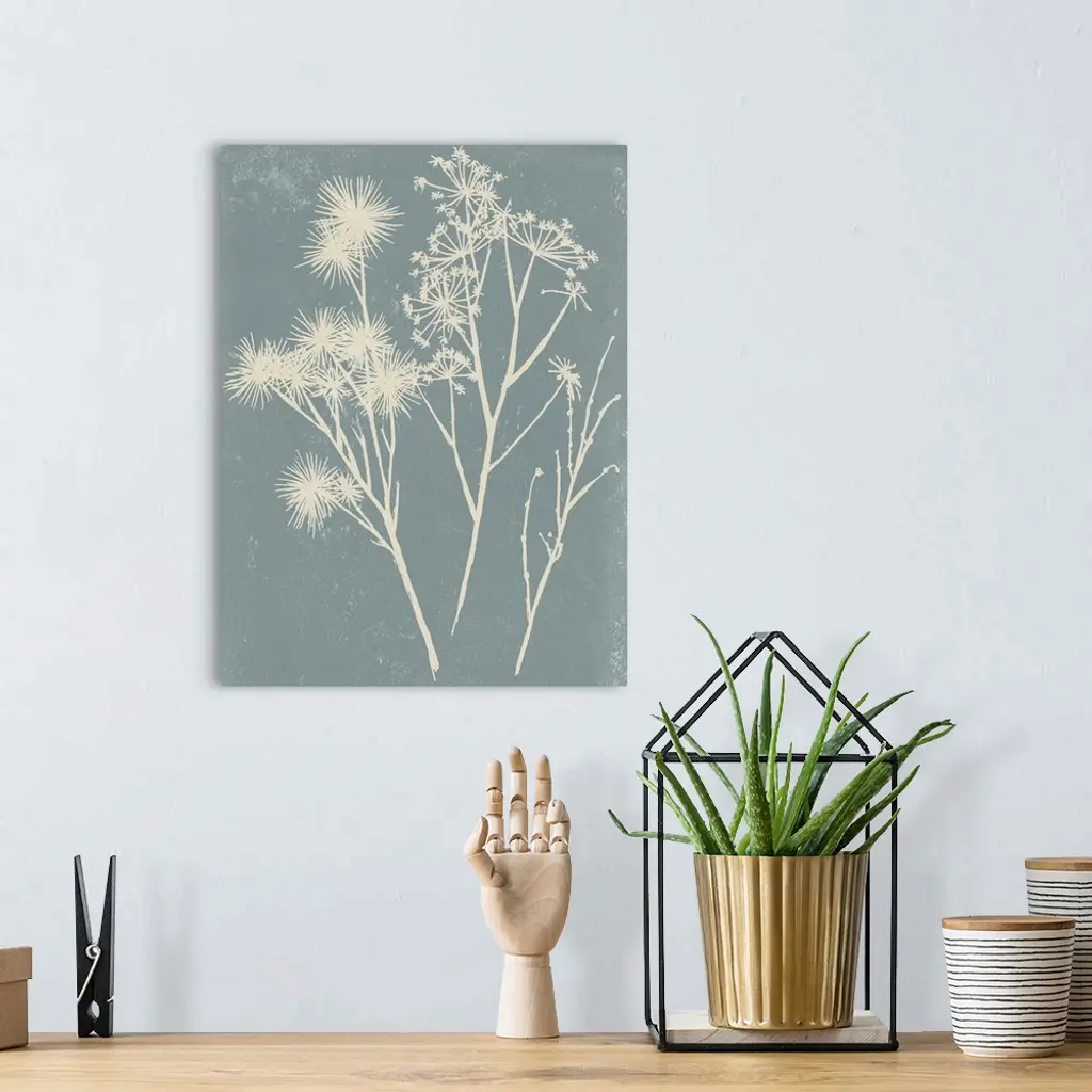 Beige silhouettes of wild flowers on a gray background with white speckles.