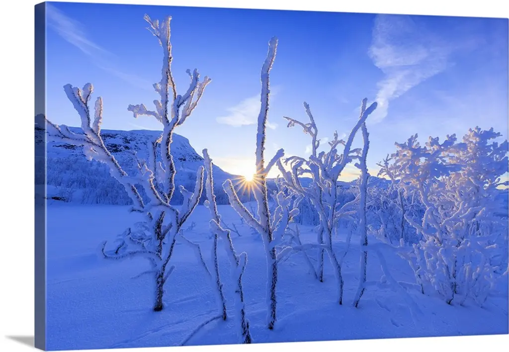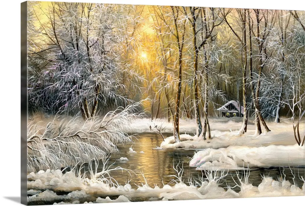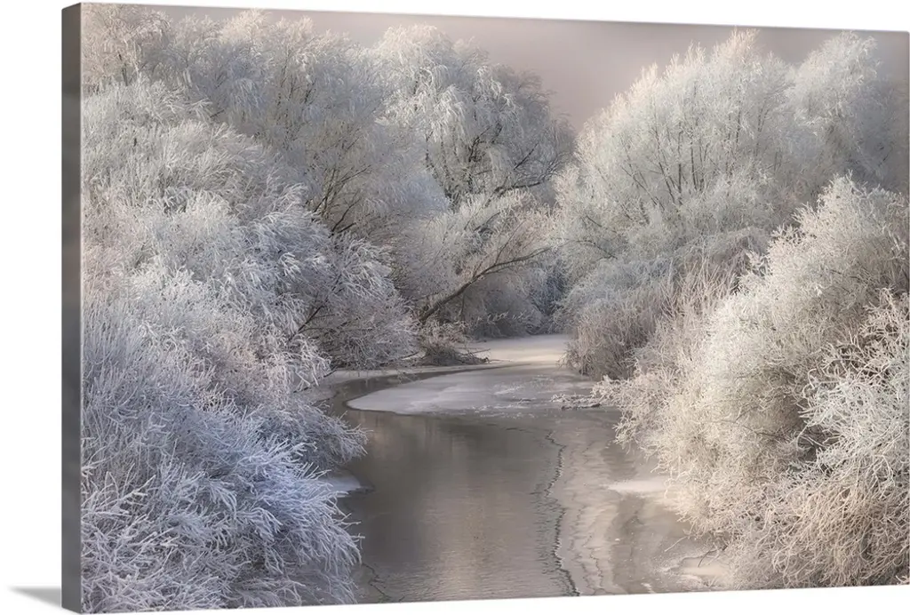 Small Stream In A Hoarfrost Covered Forest With Rays Of Sun Filtering Through The Fog