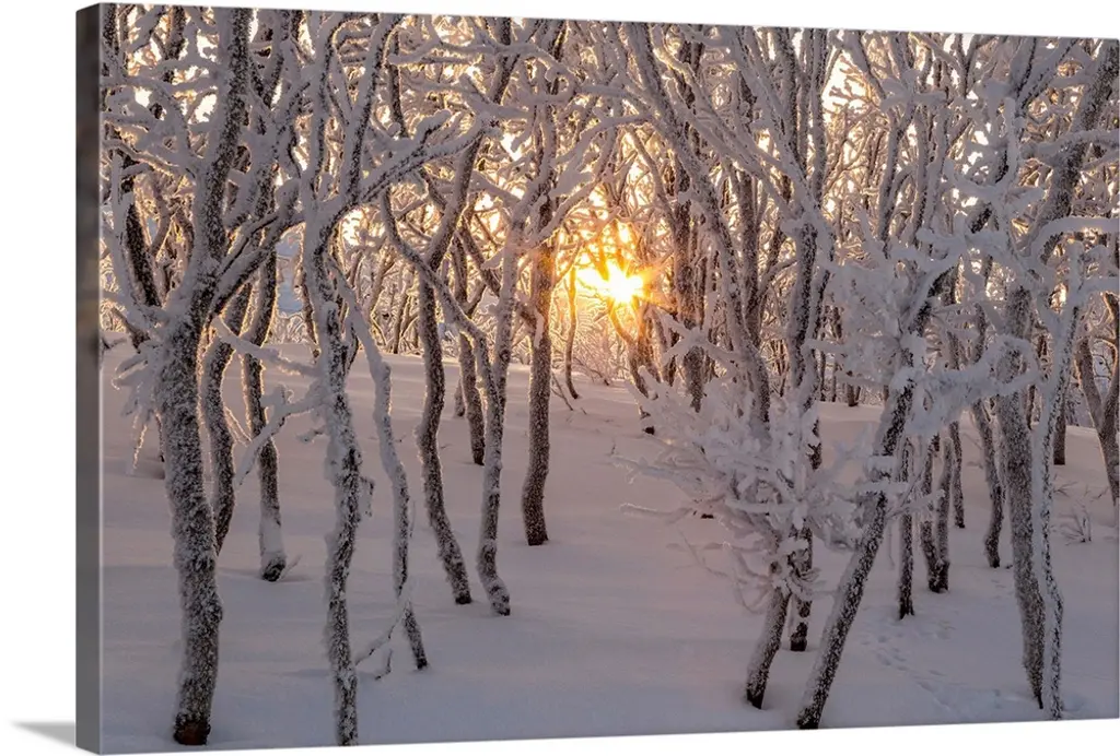 Photo of the rays of sun filtering through the fog next to a small stream flowing through a hoarfrost covered forest, winter, Russian Jack Park, Anchorage, Southcentral Alaska, USA. Digitally Enhanced.