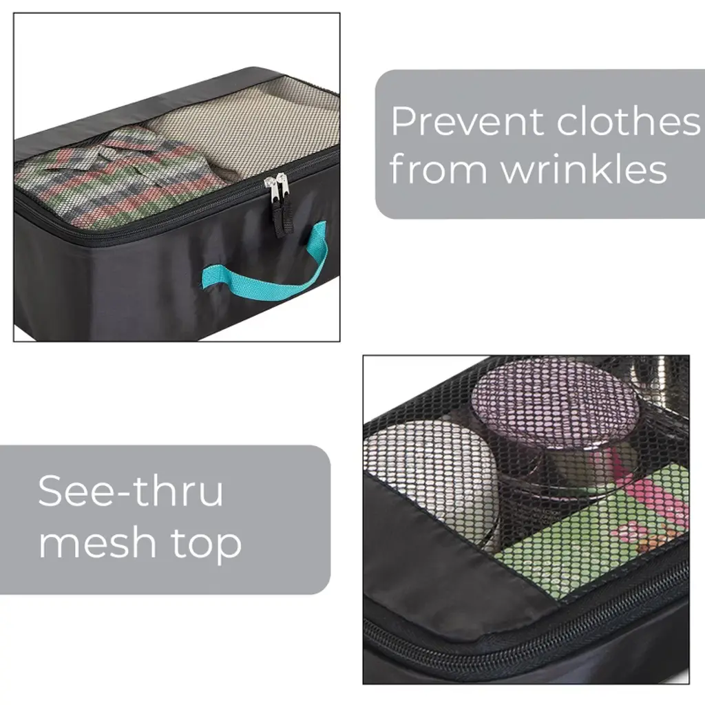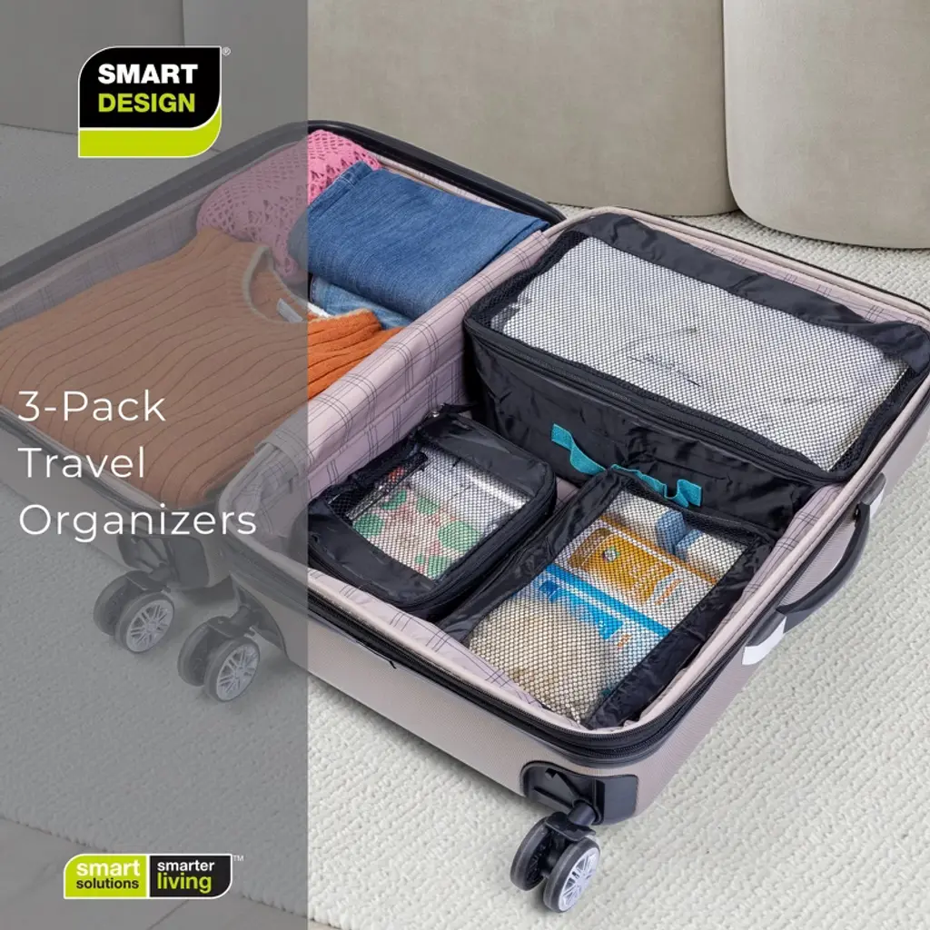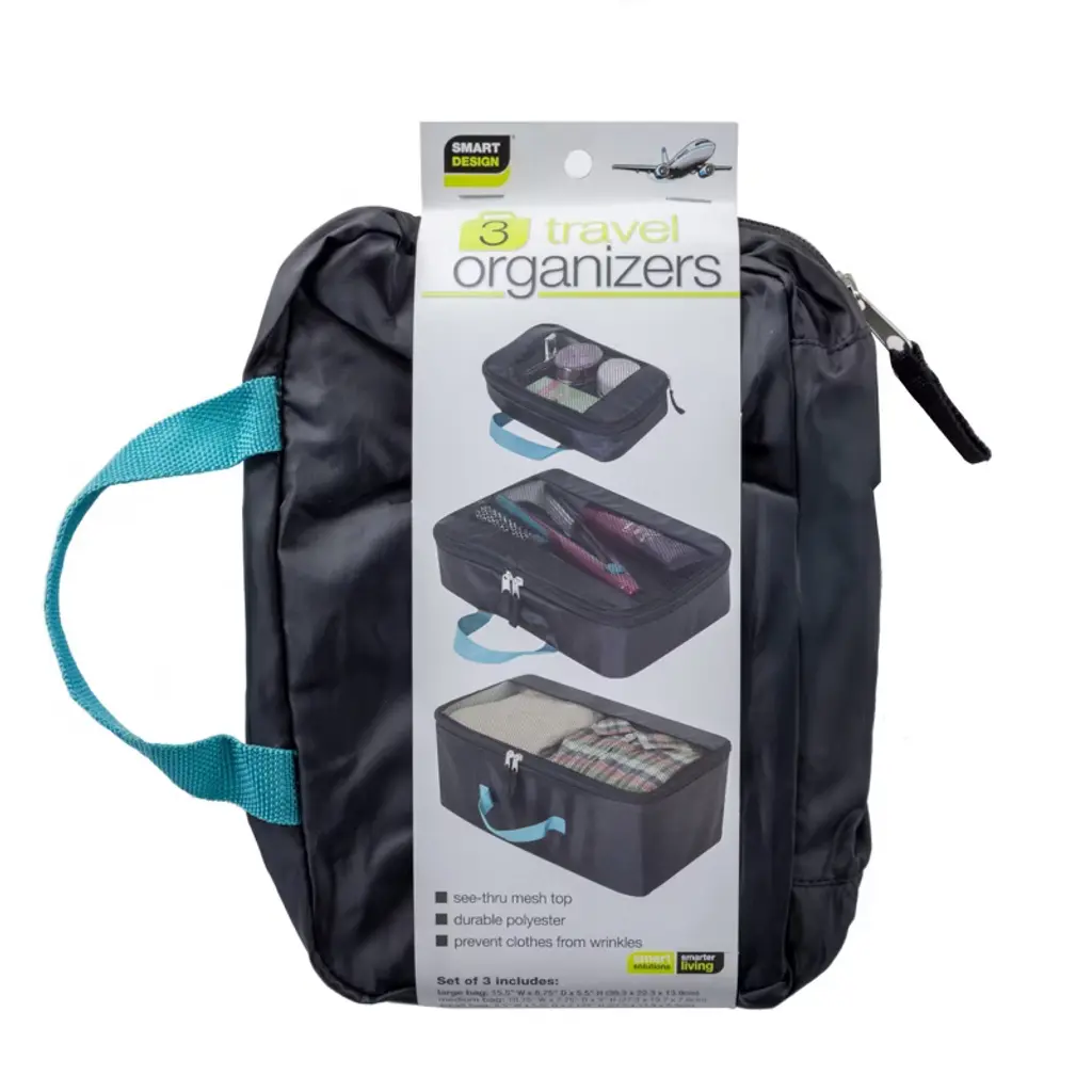 DESCRIPTION Smart Design 3 Pack Travel Set. This set includes 3 Bags: 1 Small Bag, 1 Medium Bag, & 1 Large Bag for storage and travel. These bags are made of durable heavy-duty polyester and have secure see-thru mesh zippered closure. FEATURES Easy to clean mesh polyester bags with see-through mesh. Heavy-duty reinforced handles for constant use. SPECS Measurements: Large Bag: 15.5(L) x 9(W) x 5.5(H) inchesMedium Bag: 11(L) x 8(W) x 3(H) inchesSmall Bag: 8.5(L) x 5.5(W) x 2.5(H) inches Color: Black Material: Heavy Duty Polyester MaterialKeep your packing neat, organized, and stress-free with our Mesh Travel Bag Set. Designed for versatile storage, this set includes three durable, heavy-duty polyester bags in small, medium, and large sizes, perfect for separating clothes, shoes, and travel essentials. Each bag features a see-through mesh panel for quick visibility, plus a secure zippered closure to keep items in place while on the go. The lightweight yet sturdy construction is ideal for frequent travelers, gym visits, camping, or everyday organization. Reinforced handles ensure comfortable carrying, while the bags fold flat for convenient storage when not in use.