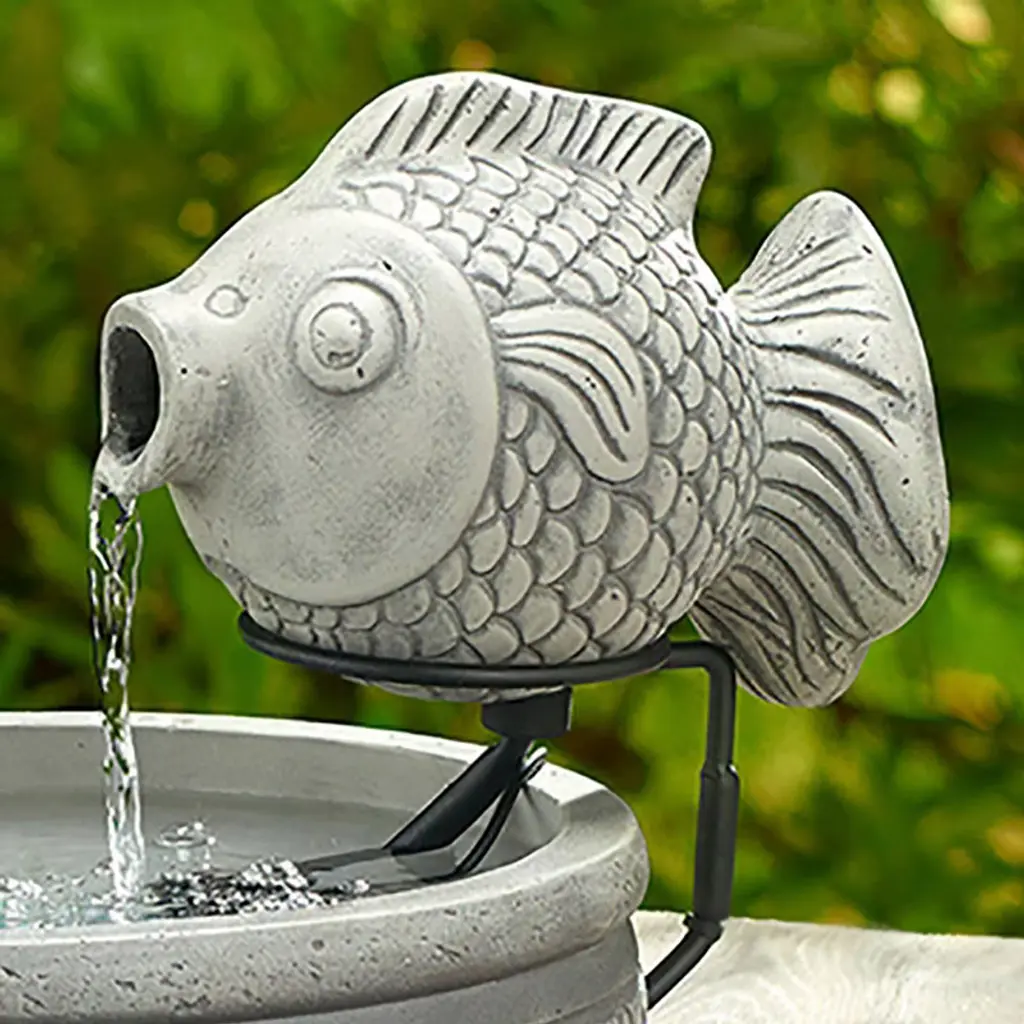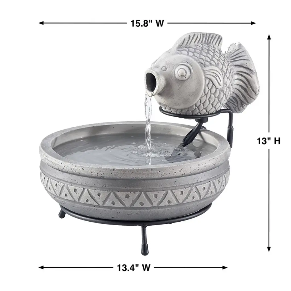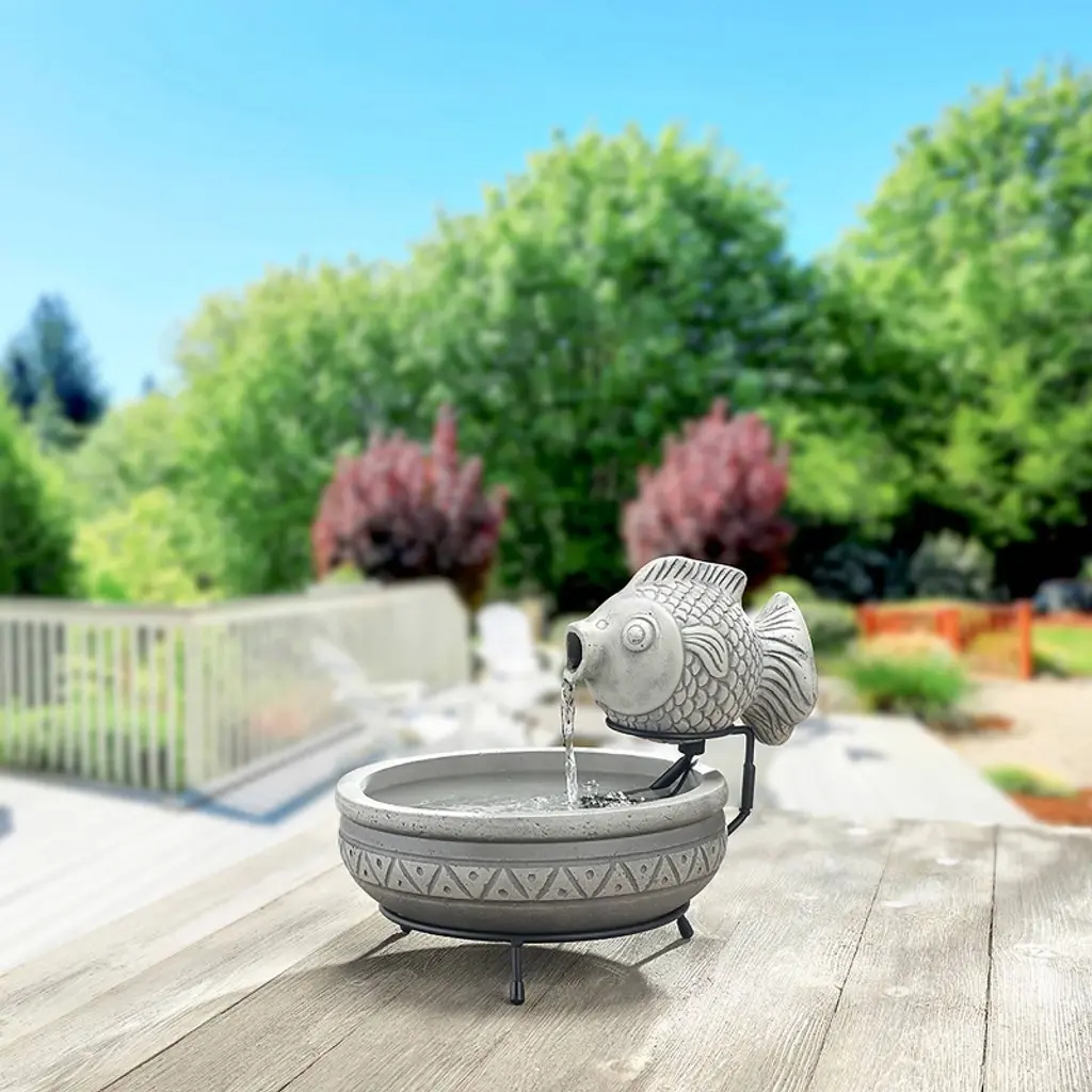 The Marin Solar Fish Fountain is a beautiful grey cement finish that runs on traditional solar technology and operates in direct sunlight. It's neutral color scheme and detailed fish design make it the perfect water feature to add to your garden, patio, deck or balcony. The water flows elegantly from the fish's mouth into the bowl and offer tranquil water sounds. Note: Freezing causes damage. Do not leave outside in winter. Empty water and store whole unit indoors (shed/garage) before temps at night get low enough for frost.