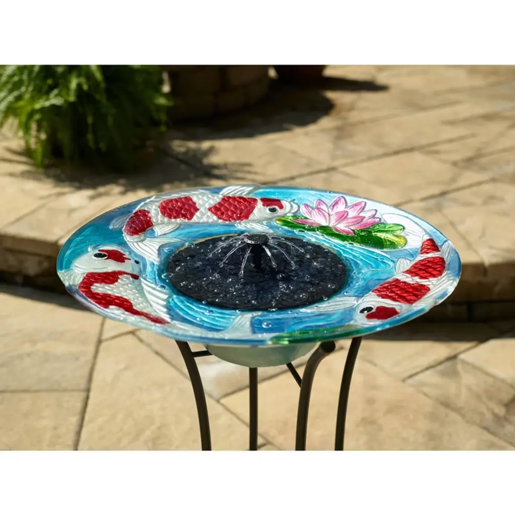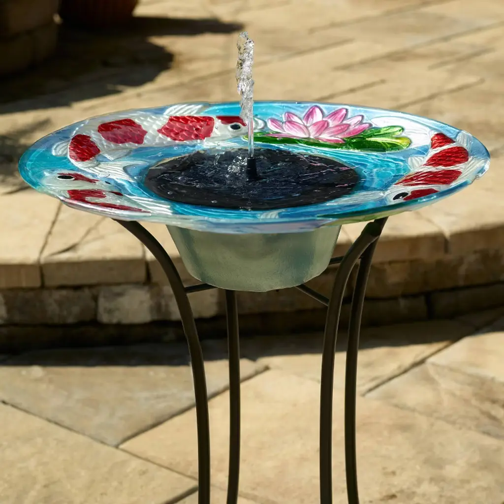 Hand painted glass and streaming, bubbling water are a combination so beautiful we had to create an entire collection of glass birdbaths! The Koi’s bowl features three white and red koi fish swimming in a bed of ocean blue water and one pink lotus. The powder coated black steel frame is easy to assemble and locks into place to ensure stability.Simply place in a sunny spot outdoors and the patented solar panel will begin to power the pump. During cloudy weather, the pump may start and stop as clouds block the sun. Two fountain heads are included, allowing you to switch between a bubbling and umbrella spray feature.
