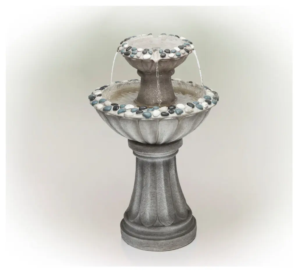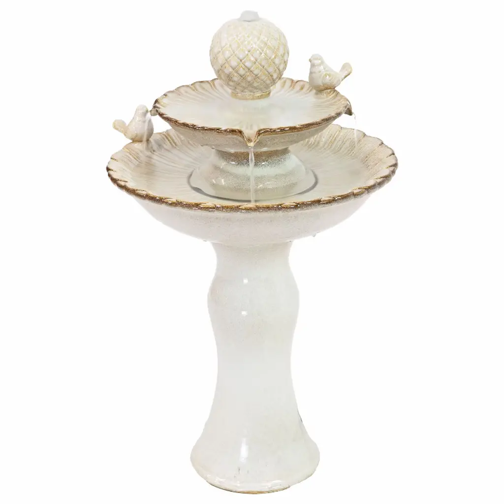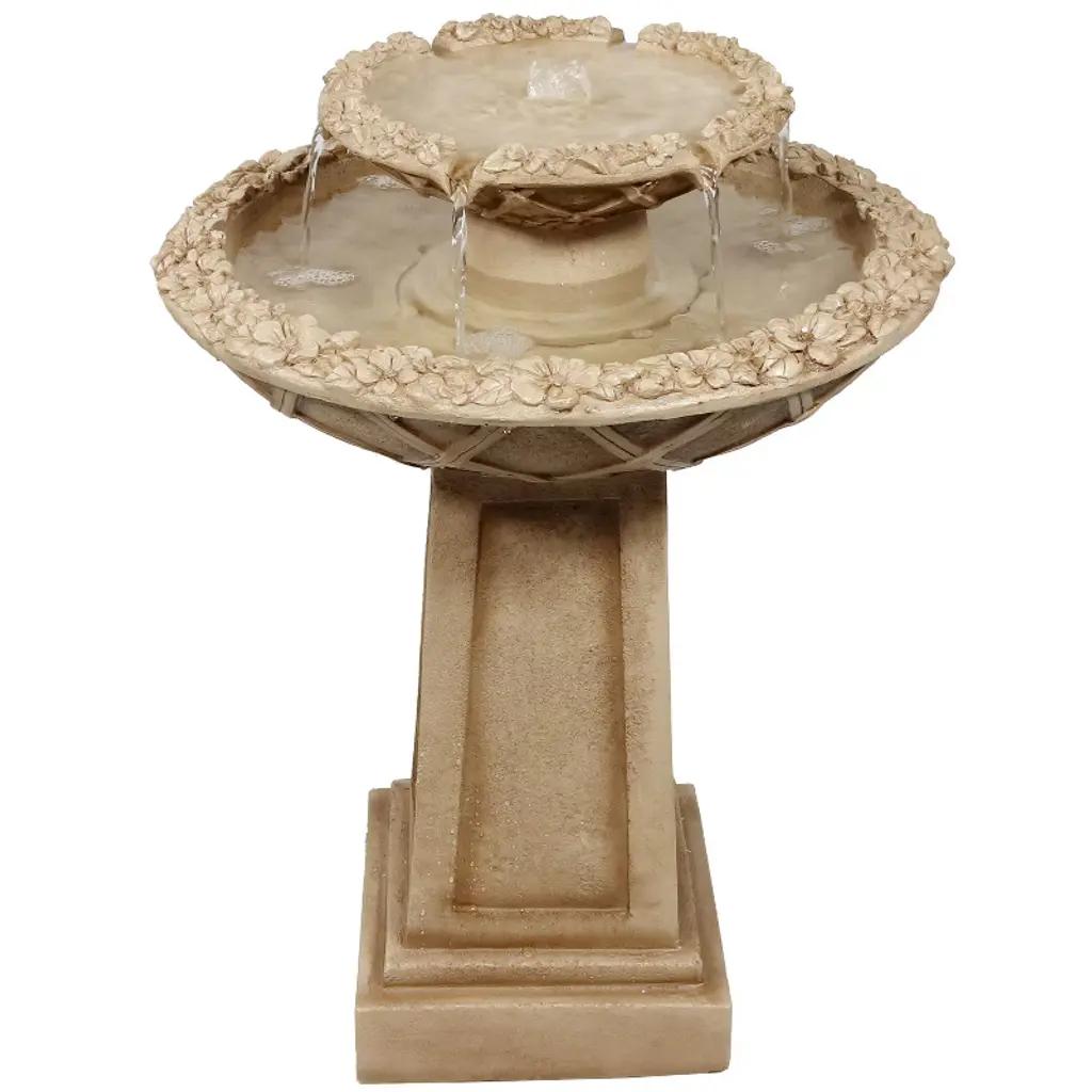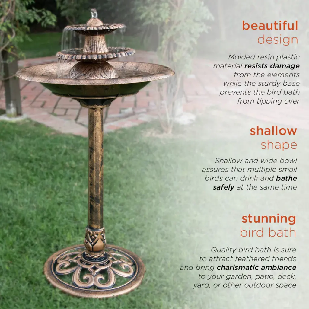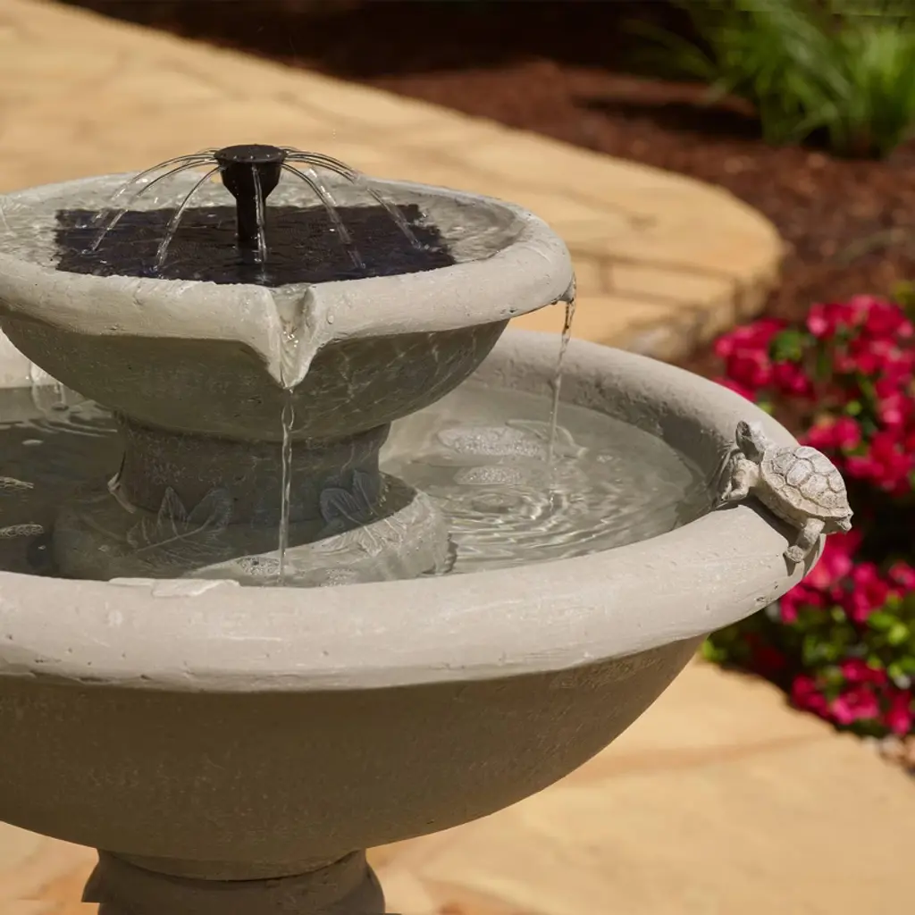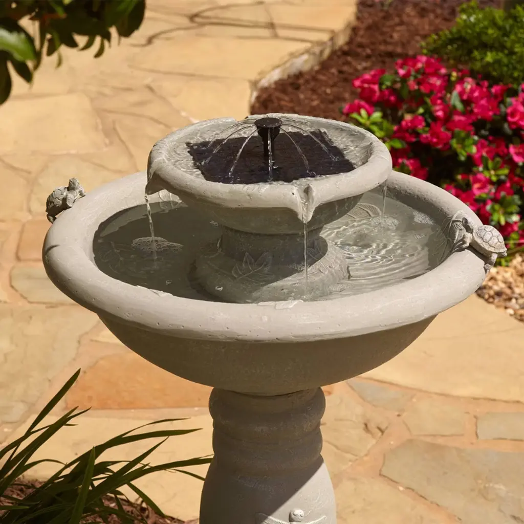 The Country Gardens IntelliSOLAR Birdbath creates a soothing and relaxing atmosphere on your patio, deck, balcony or in your garden. It comes in an elegant, weathered stone finish and features two turtles on the bowl's edge (removable if desired). Two fountain heads are included, allowing you to switch between a bubbling and umbrella spray feature. Simply place in a sunny spot outdoors and the patented IntelliSOLAR panel will begin to power the pump. During cloudy weather, the backup battery will take over ensuring your birdbath continues to stream. Two fountain heads are included, allowing you to switch between a bubbling and umbrella spray feature.