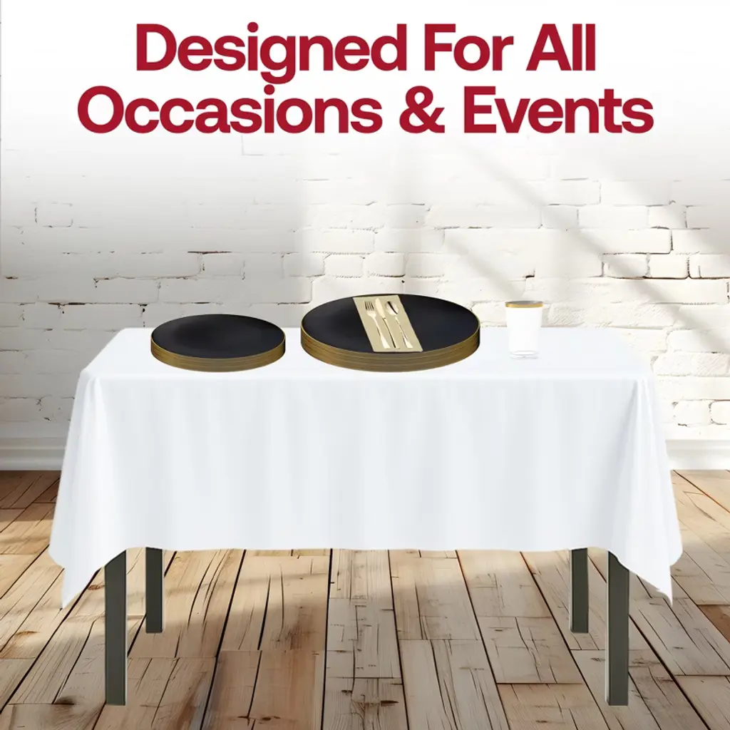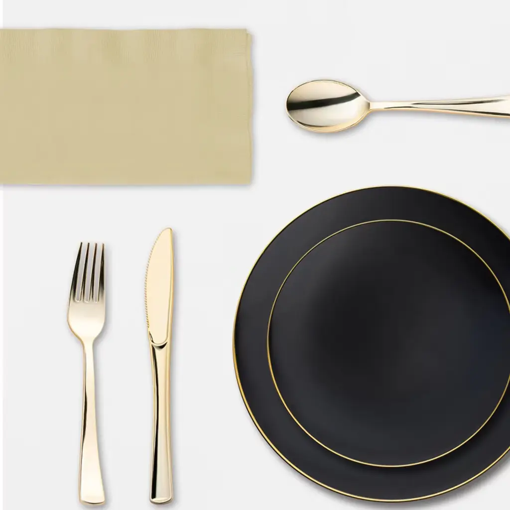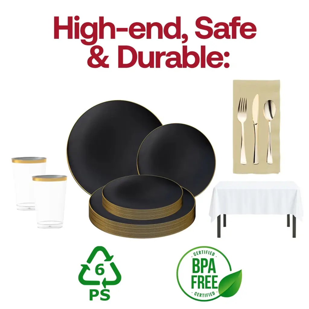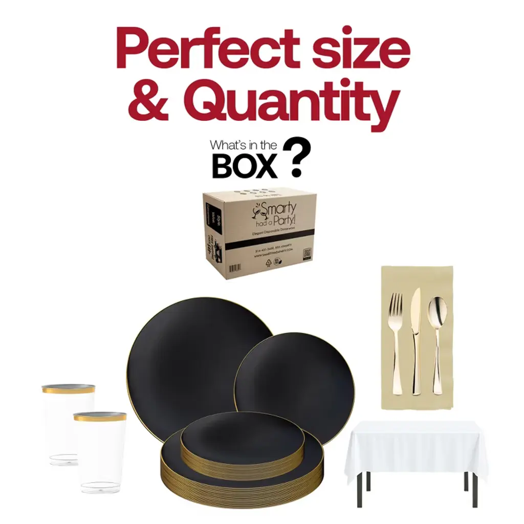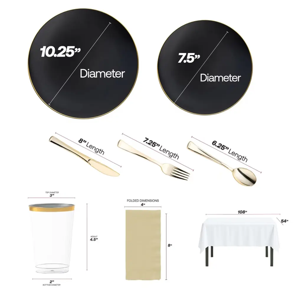 Elevate your celebration with this elegant disposable dinnerware set for 20 guests, designed with a striking black and gold theme. Featuring premium plastic plates, gold cutlery, clear tumblers with gold accents, soft ivory napkins, and crisp white tablecloths, this complete set blends style and convenience for weddings, anniversaries, birthdays, and formal gatherings. Durable yet disposable, it ensures effortless cleanup while keeping your table looking sophisticated and coordinated.