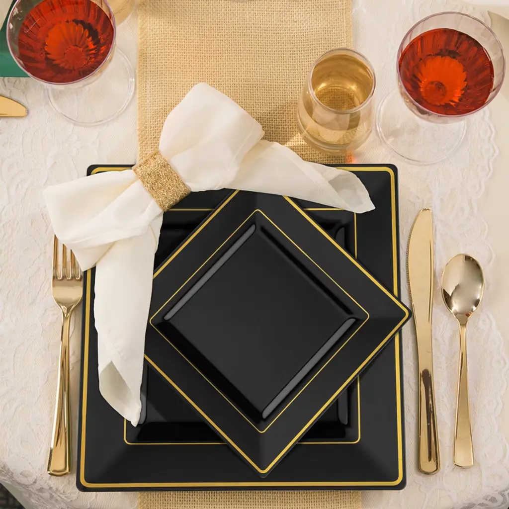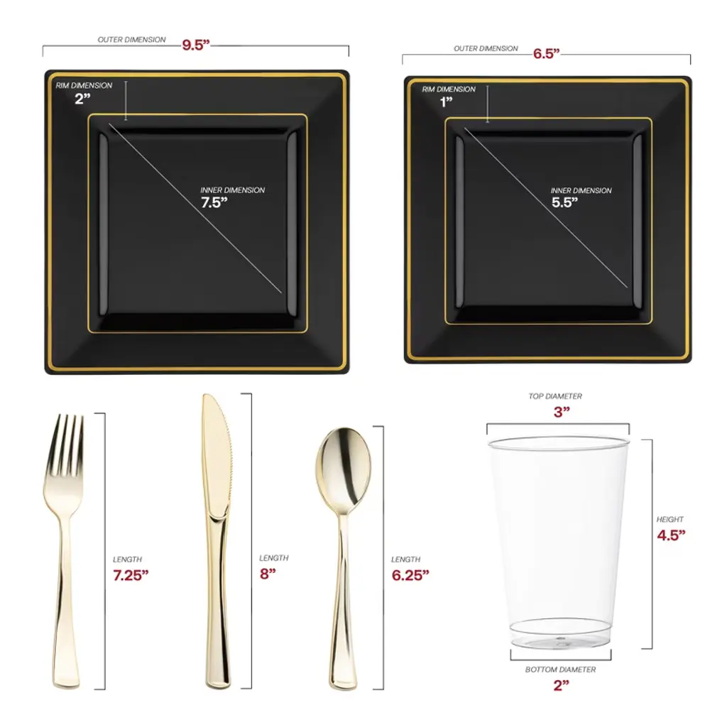 Make your wedding reception a stylish affair with this impressive disposable plastic tableware value set. This comprehensive set includes 60 dinner plates, 60 salad plates, 60 forks, 60 spoons, 60 knives, and 60 12 oz. tumblers, providing everything you need for an elegant dining experience. Crafted with durable plastic, each piece features a sophisticated black design with a stunning gold square edge rim, adding a touch of glamour to your table settings. Perfect for adding a touch of luxury to any wedding or special event, this value set ensures convenience and sophistication without compromising on style.