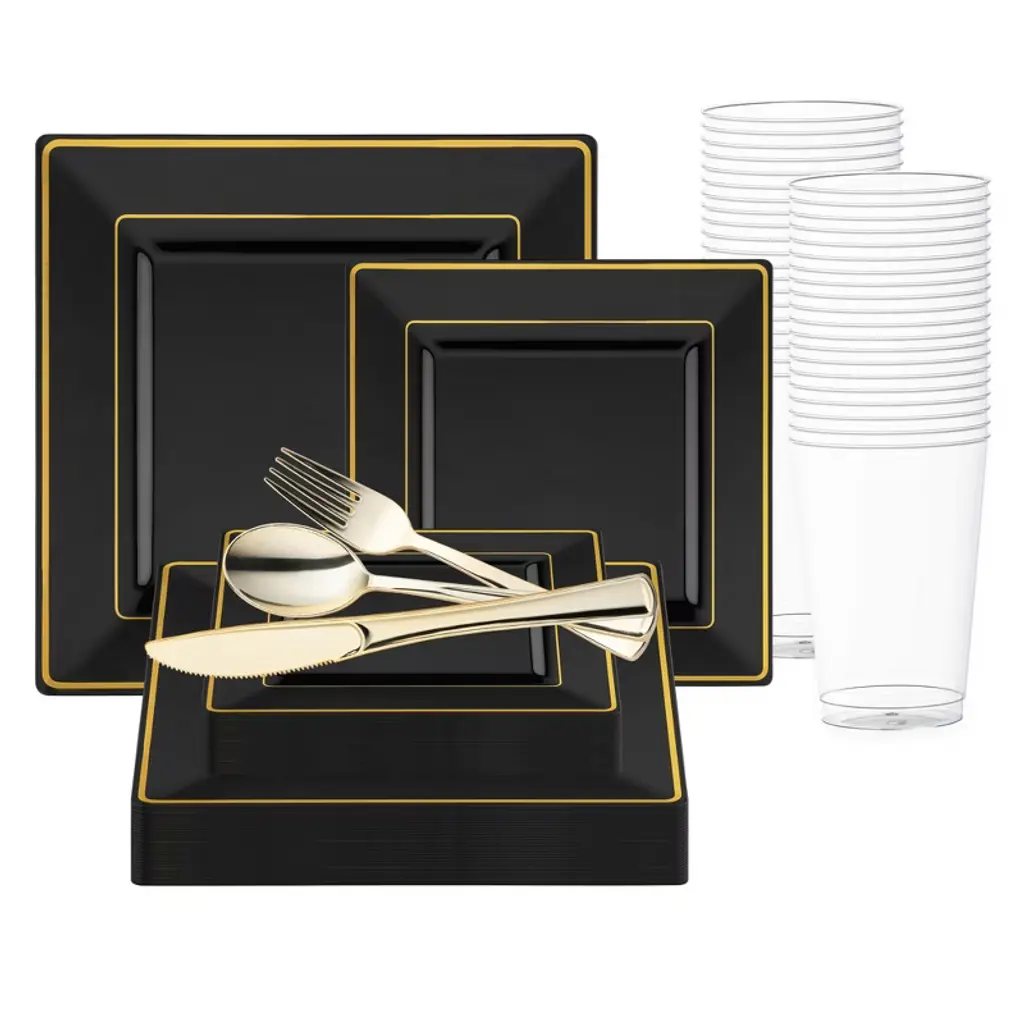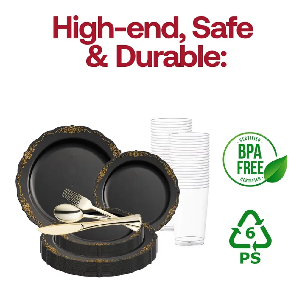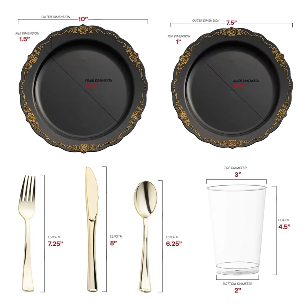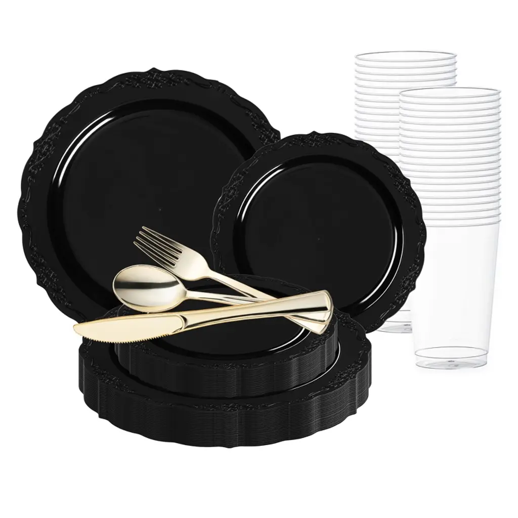 This stylish disposable plastic wedding value set combines elegance and convenience for your special day. Featuring a timeless black design accented by gold vintage rims, this set adds a touch of sophistication to any wedding reception. With 120 dinner plates, 120 salad plates, 120 forks, 120 spoons, 120 knives, and 120 12 oz. tumblers, it offers everything you need for seamless dining. Crafted from high-quality plastic, these disposable pieces provide the look of fine china without the cleanup. Elevate your event with this stylish and practical value set, ensuring your guests dine in style without compromise.