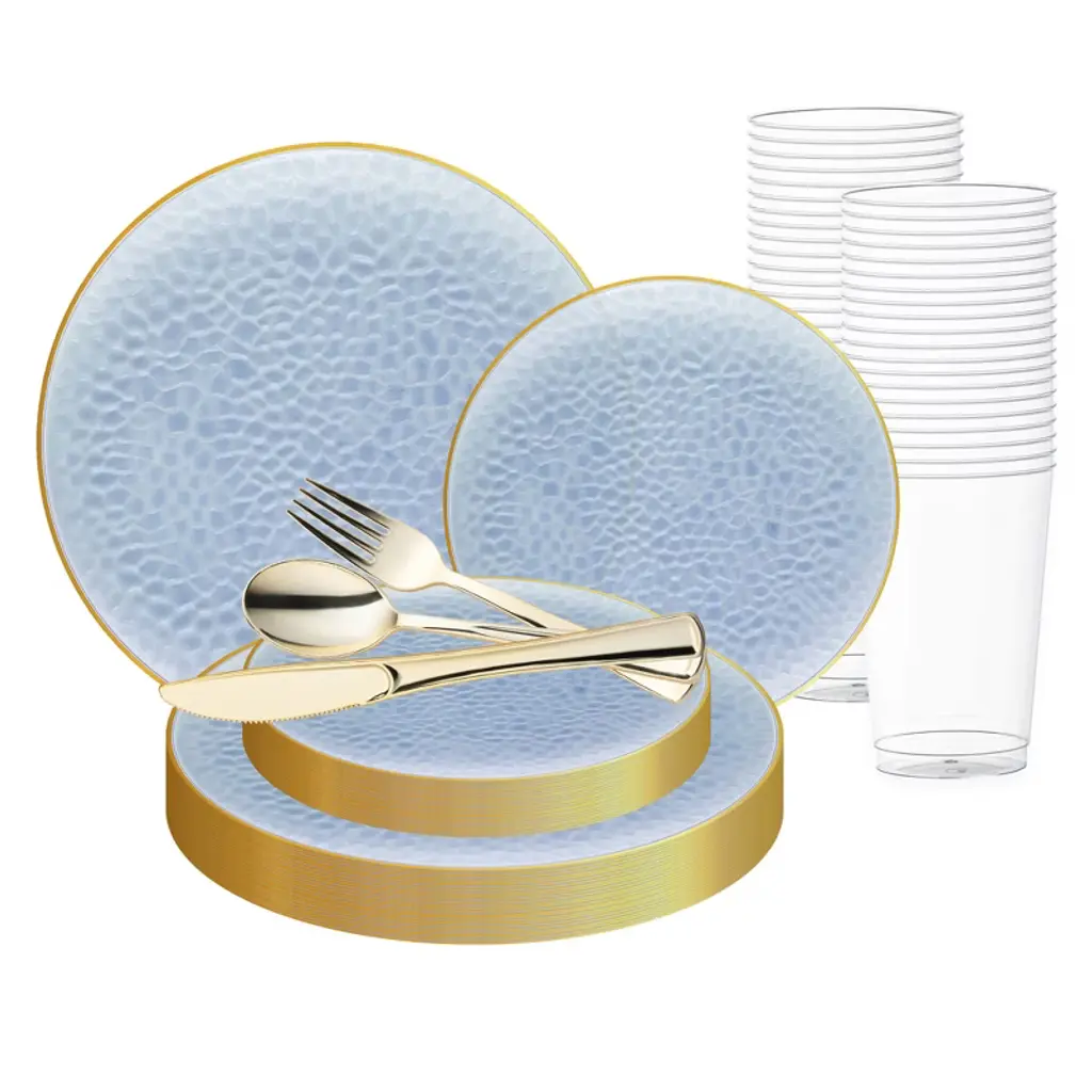 Purchase our Clear Pink with Gold Rim Disposable Wedding Set. Elegant, convenient, and perfect for your big day. Shop now in bulk and enjoy discounts!