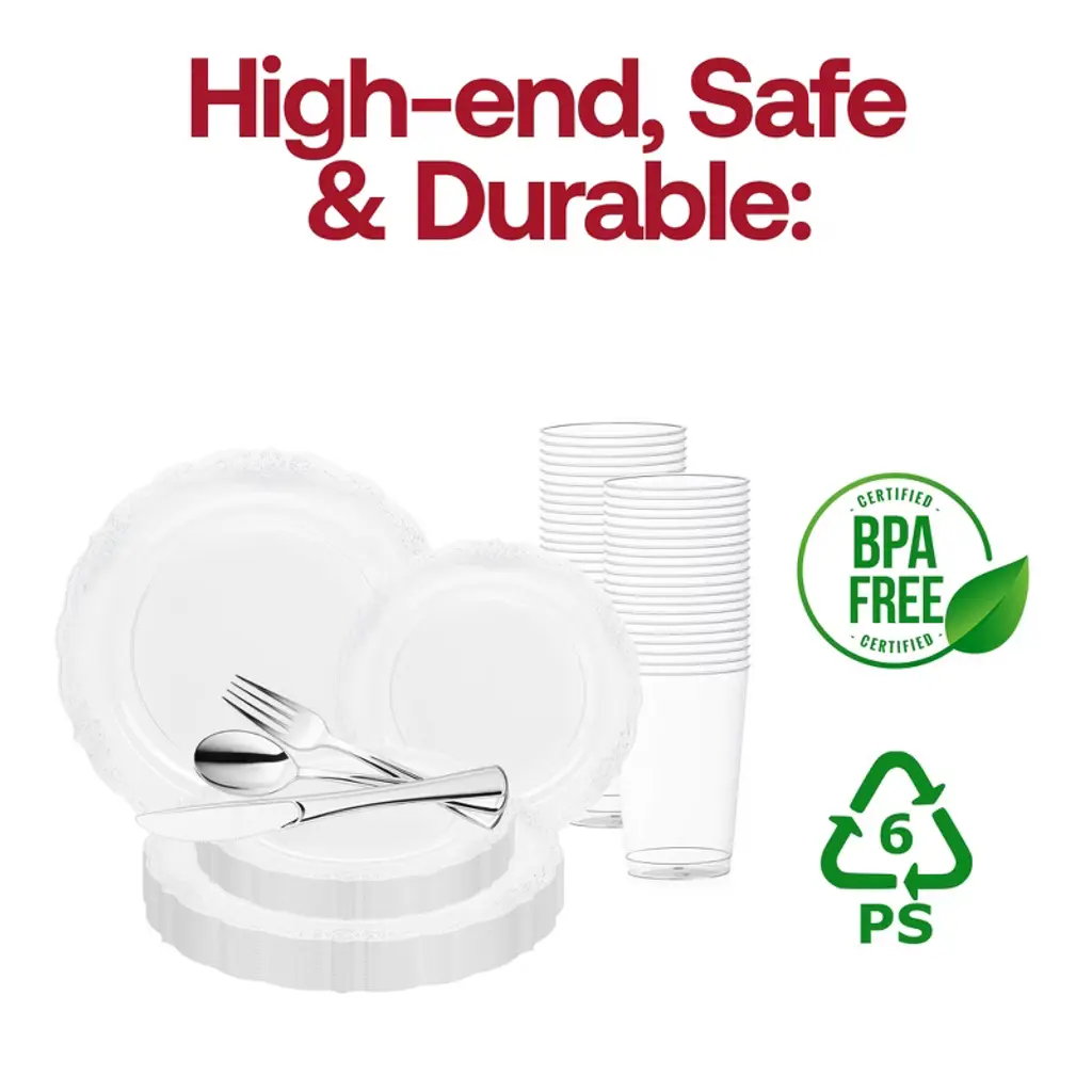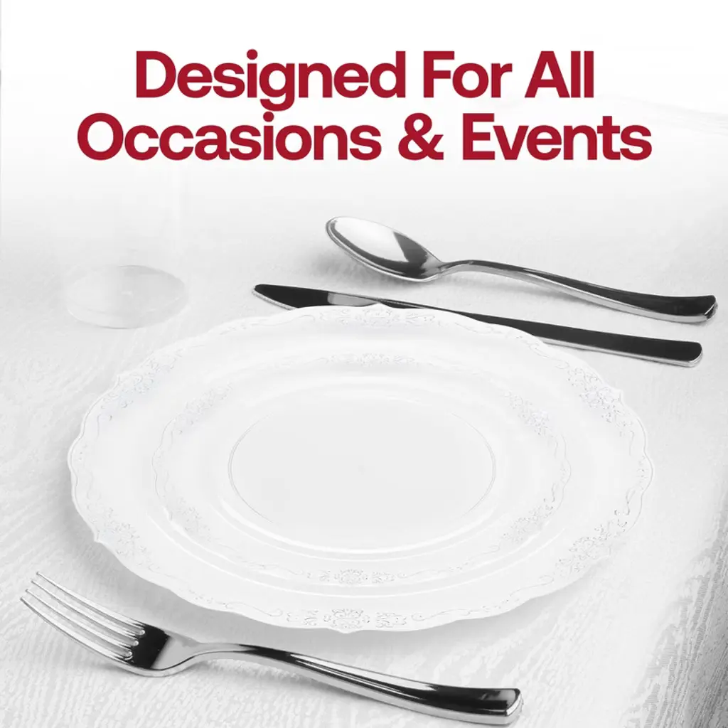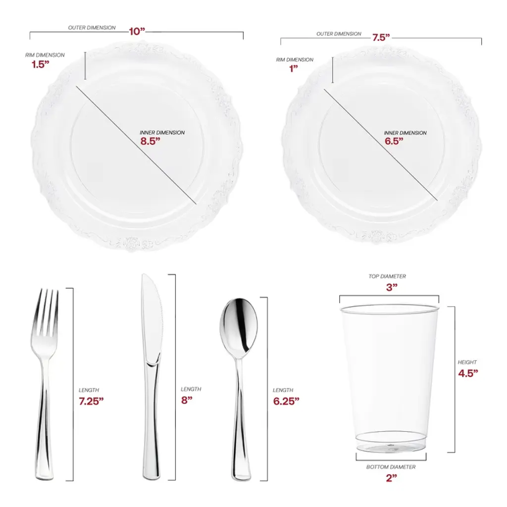 Order our Clear with Silver Vintage Rim Disposable Plastic Set at the lowest price. Upgrade your wedding essentials buy now and celebrate in style!