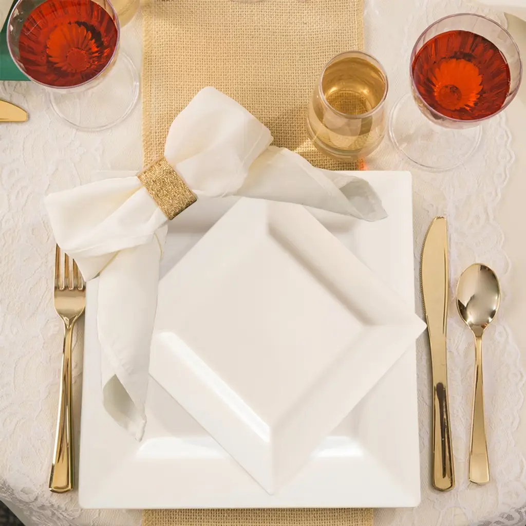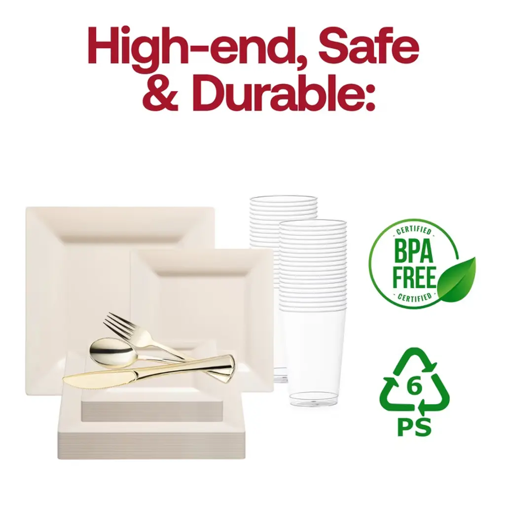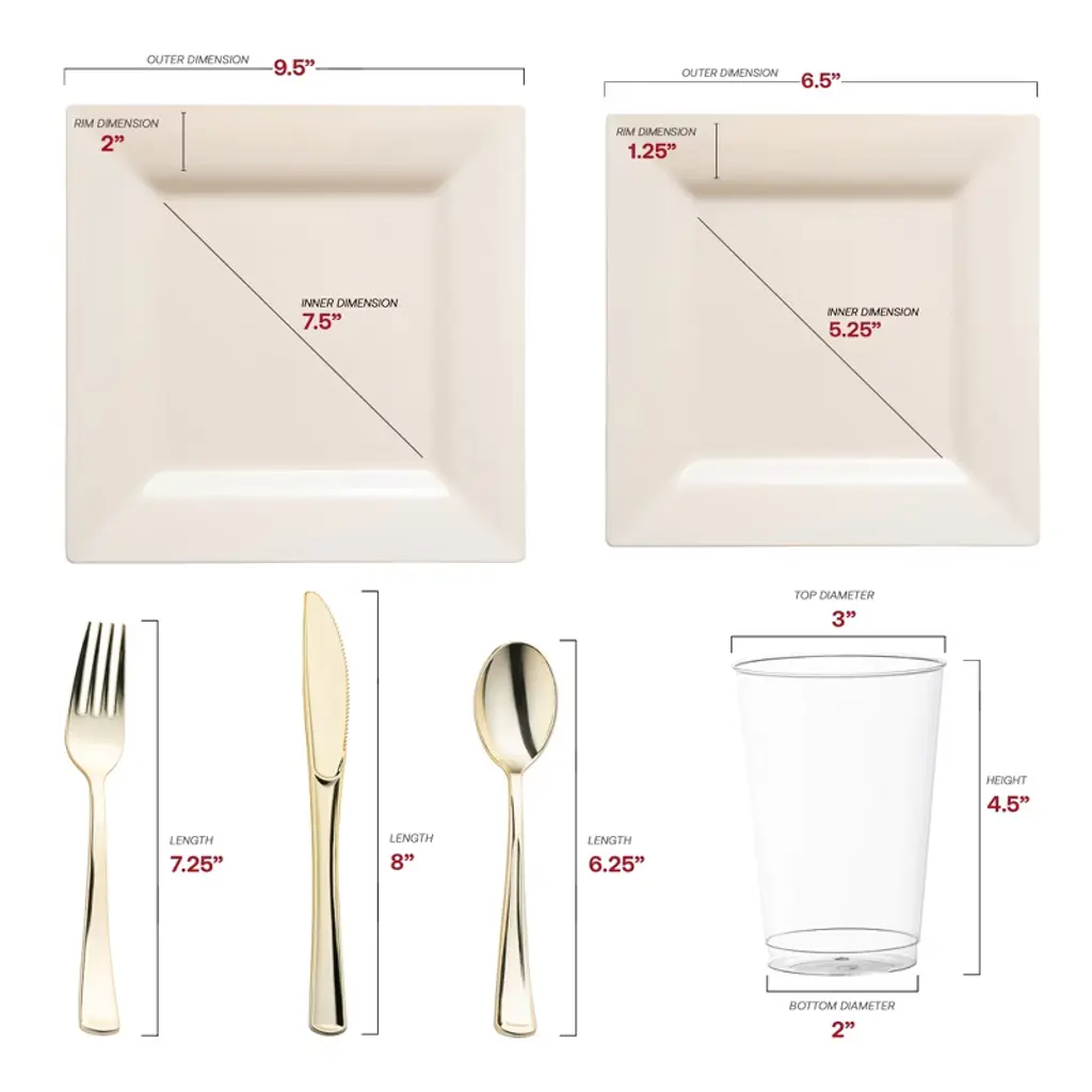 Enhance the elegance of your wedding reception with this luxurious disposable plastic tableware value set. This extensive collection includes 120 dinner plates, 120 salad plates, 120 forks, 120 spoons, 120 knives, and 120 12 oz. tumblers, ensuring a seamless dining experience for all guests. The square design adds a modern flair to your table setting, while the soft ivory hue exudes sophistication. Crafted from durable plastic, each piece combines style with practicality, allowing for effortless cleanup without compromising quality. Elevate your special day with this refined and comprehensive tableware set, creating a memorable atmosphere for your celebration.