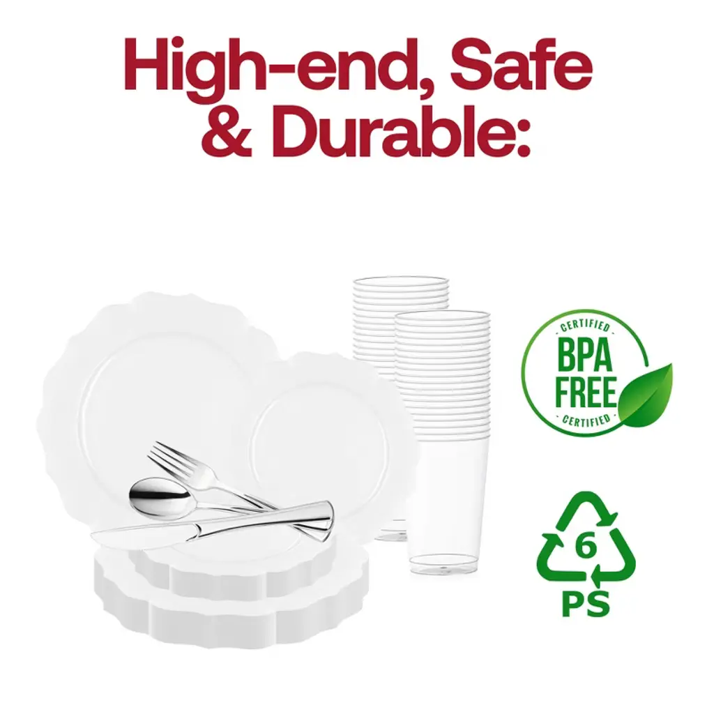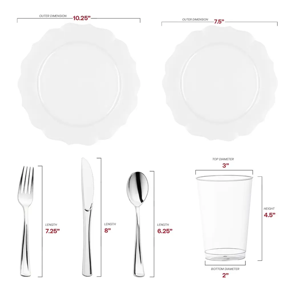 Buy our Pearl White Lotus Plastic Wedding Set. Elegant plates, silver cutlery, and clear cups. Order now and make memories without the cleanup!