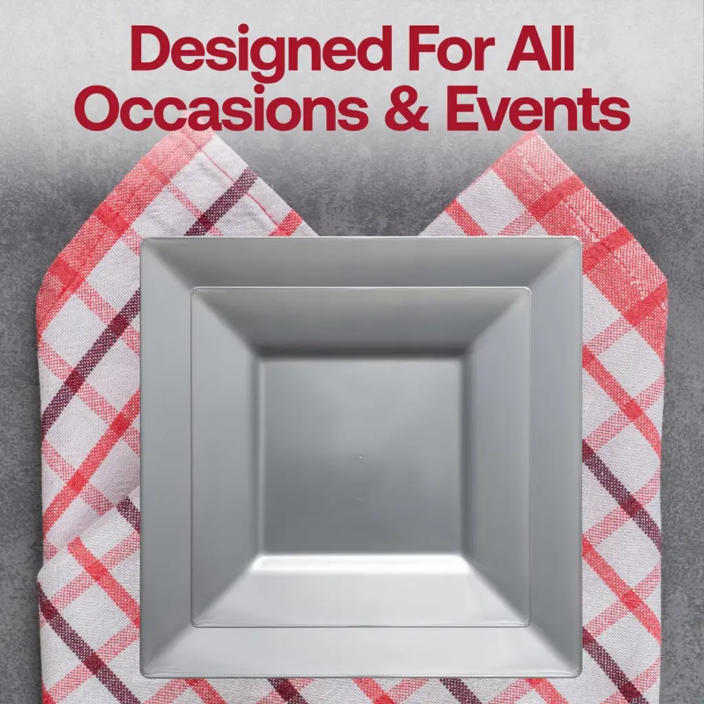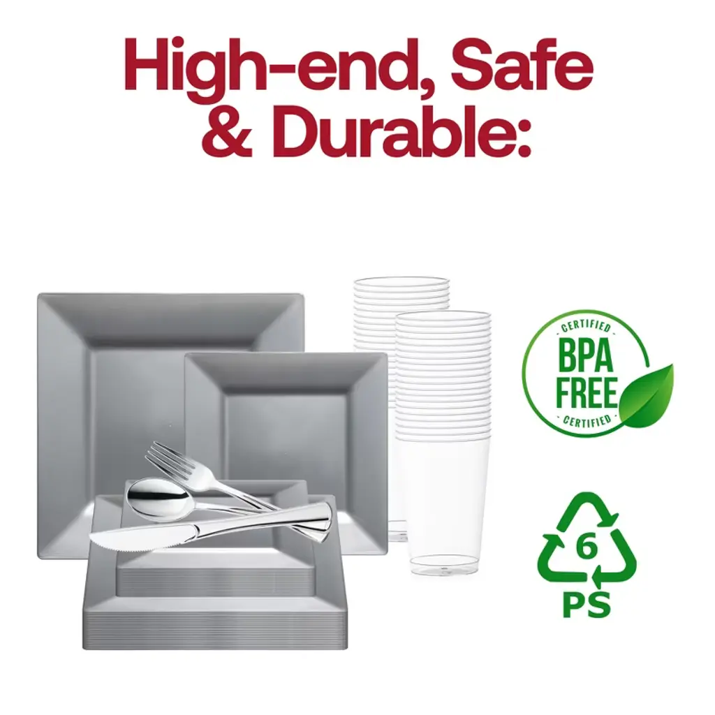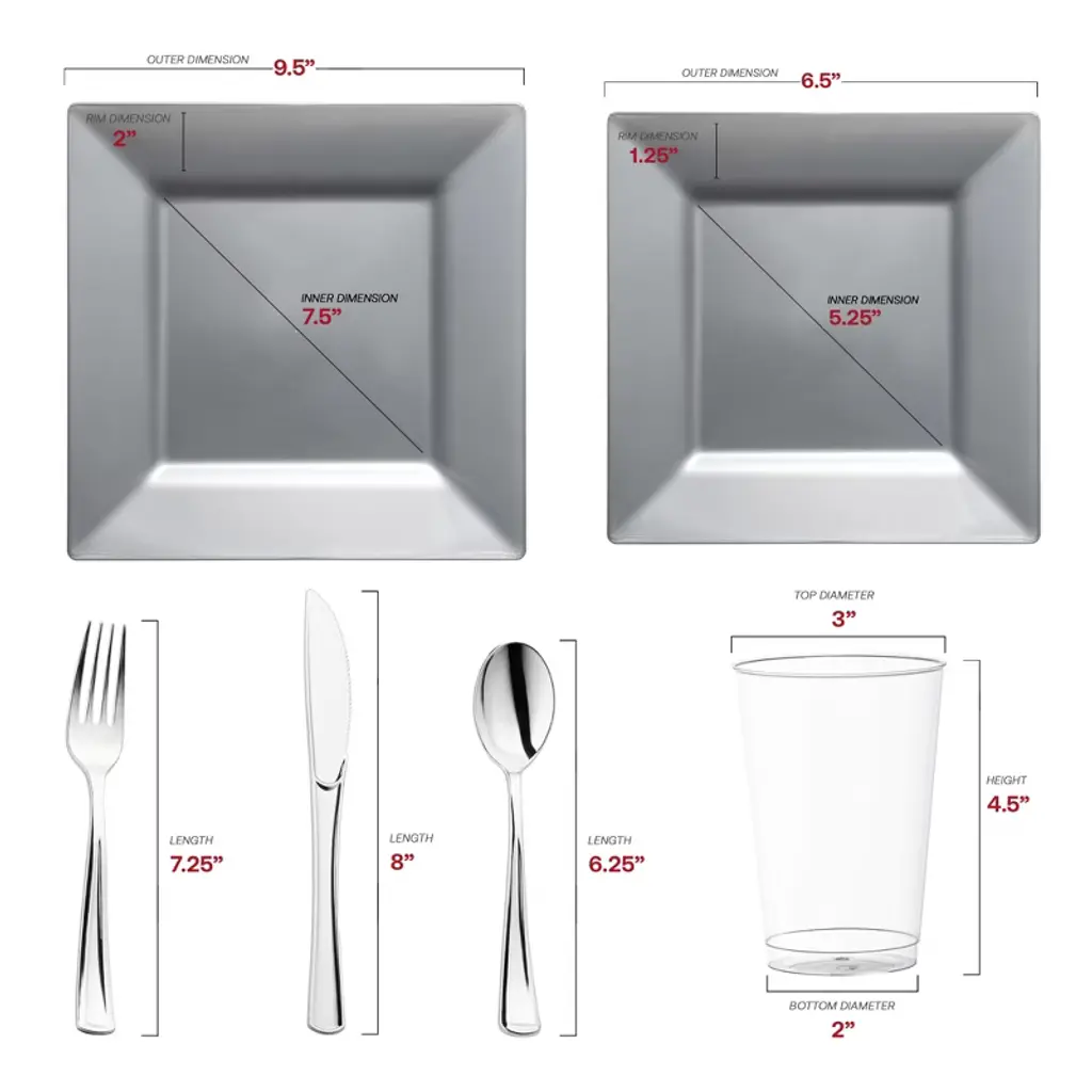 Purchase our Silver Square Plastic Wedding Set at the lowest price assured for a sophisticated tablescape. Achieve a classy wedding style on a budget.