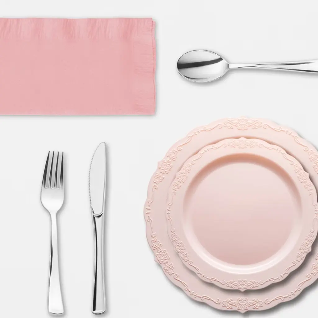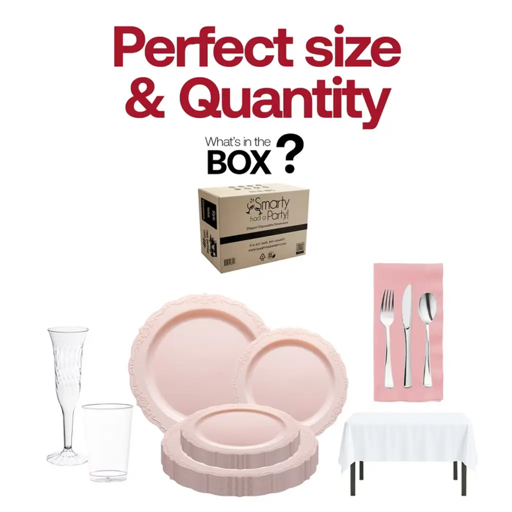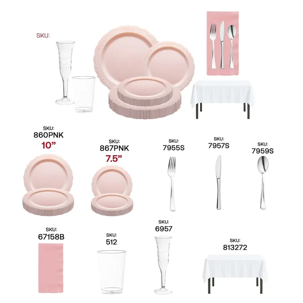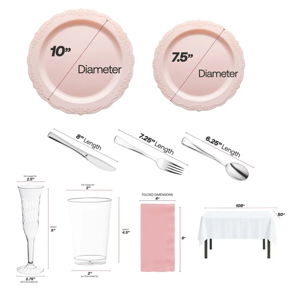 Make your celebration unforgettable with this service for 50 dinnerware set, featuring chic pink dinner and salad plates, matching napkins, and elegant silver flatware. Clear cups and champagne flutes add sophistication, while crisp white tablecloths complete the upscale look. Crafted from durable, BPA-free premium plastic, this set combines elegance with convenience, making it ideal for weddings, birthdays, bridal showers, baby showers, and festive gatherings. Enjoy the beauty of coordinated tableware with the ease of disposable cleanup.