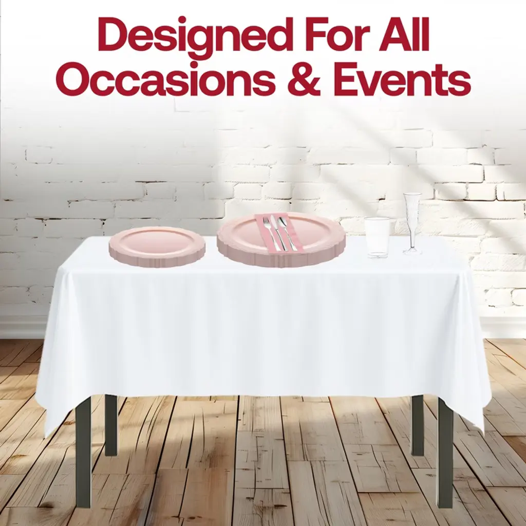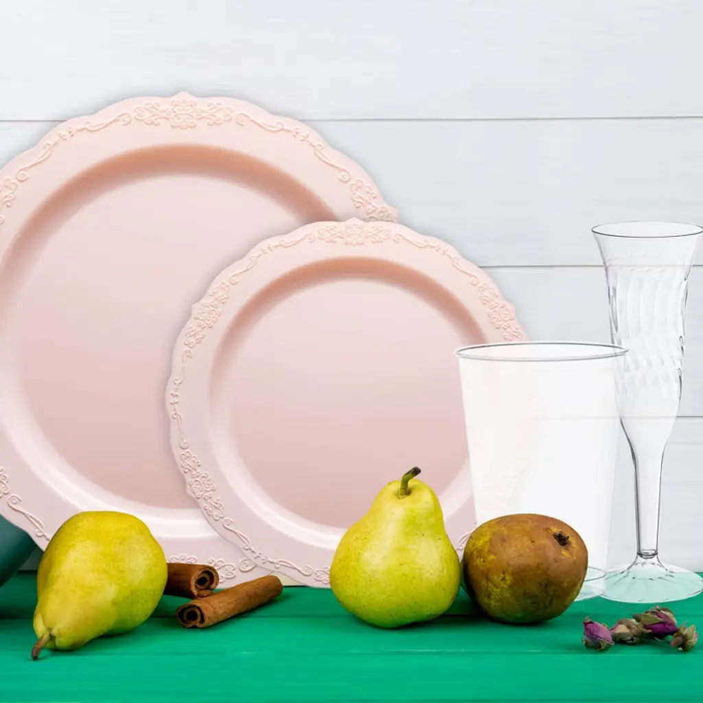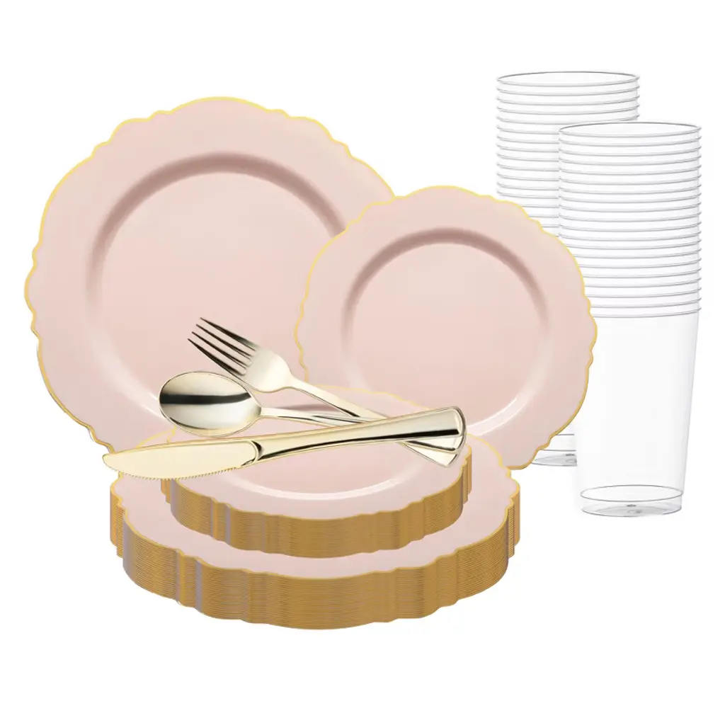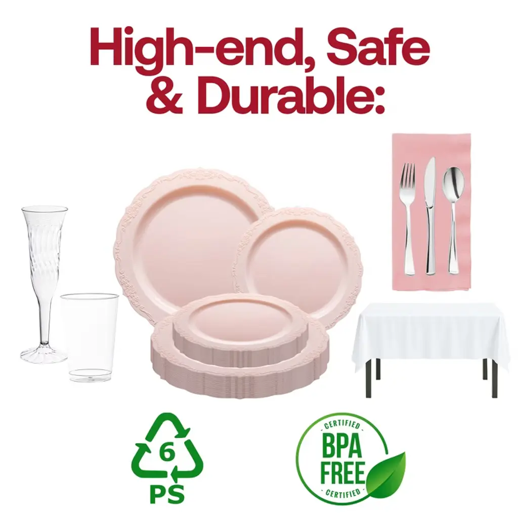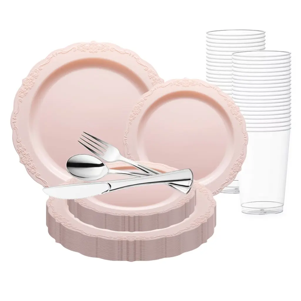 Make your celebration unforgettable with this service for 50 dinnerware set, featuring chic pink dinner and salad plates, matching napkins, and elegant silver flatware. Clear cups and champagne flutes add sophistication, while crisp white tablecloths complete the upscale look. Crafted from durable, BPA-free premium plastic, this set combines elegance with convenience, making it ideal for weddings, birthdays, bridal showers, baby showers, and festive gatherings. Enjoy the beauty of coordinated tableware with the ease of disposable cleanup.