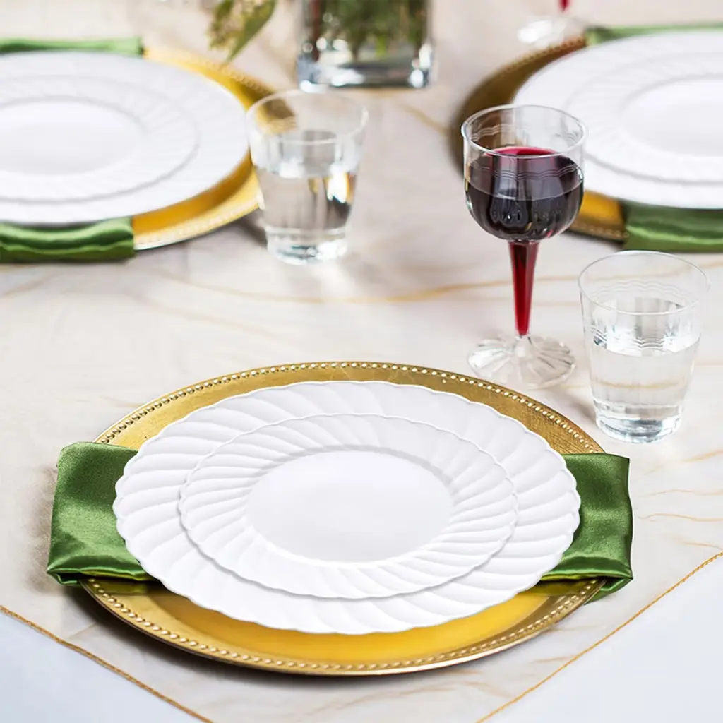 For those seeking elegance and practicality in abundance, this elegant disposable plastic wedding value set delivers with its generous offering of 72 dinner plates, 72 salad plates, 72 forks, 72 spoons, 72 knives, and 72 12 oz. tumblers. Ideal for grand celebrations, this set ensures seamless serving and dining experiences. Crafted with attention to detail, the white-flair plastic construction adds a touch of sophistication to any occasion while guaranteeing durability. From lavish weddings to upscale events, this comprehensive set elevates gatherings with refined aesthetics and functional design. Embrace convenience without sacrificing style, making every moment memorable with this impressive collection.
