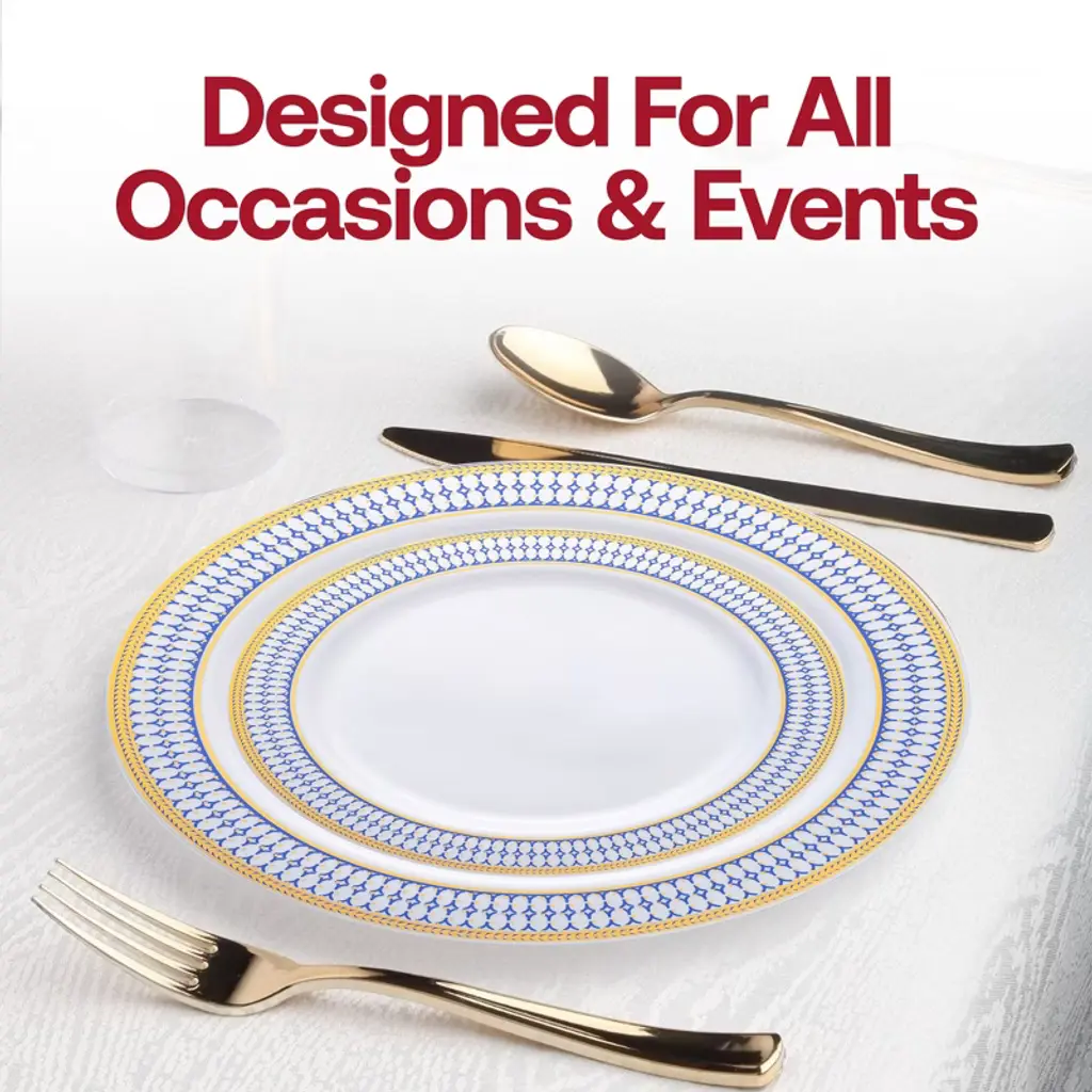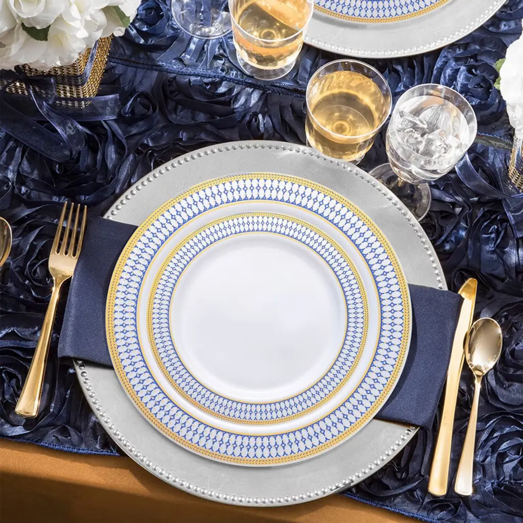 Immerse yourself in the sophistication of your special occasion with this fabulous disposable plastic wedding value set. This comprehensive collection features 120 exquisite dinner plates and 120 delicate salad plates, each adorned with enchanting blue and gold chord accents along the rims. Complemented by 120 forks, spoons, and knives, meticulously crafted for both elegance and practicality. Enhancing your dining experience are 120 12 oz. tumblers, offering a perfect balance of style and functionality. Elevate your dining experience and leave a lasting impression on your guests with this enchanting ensemble, tailored for memorable moments.