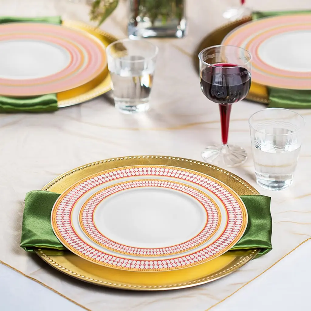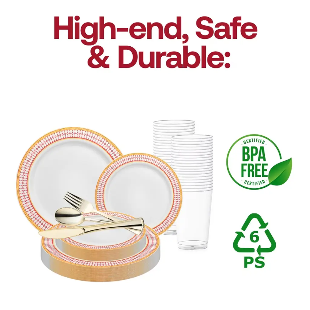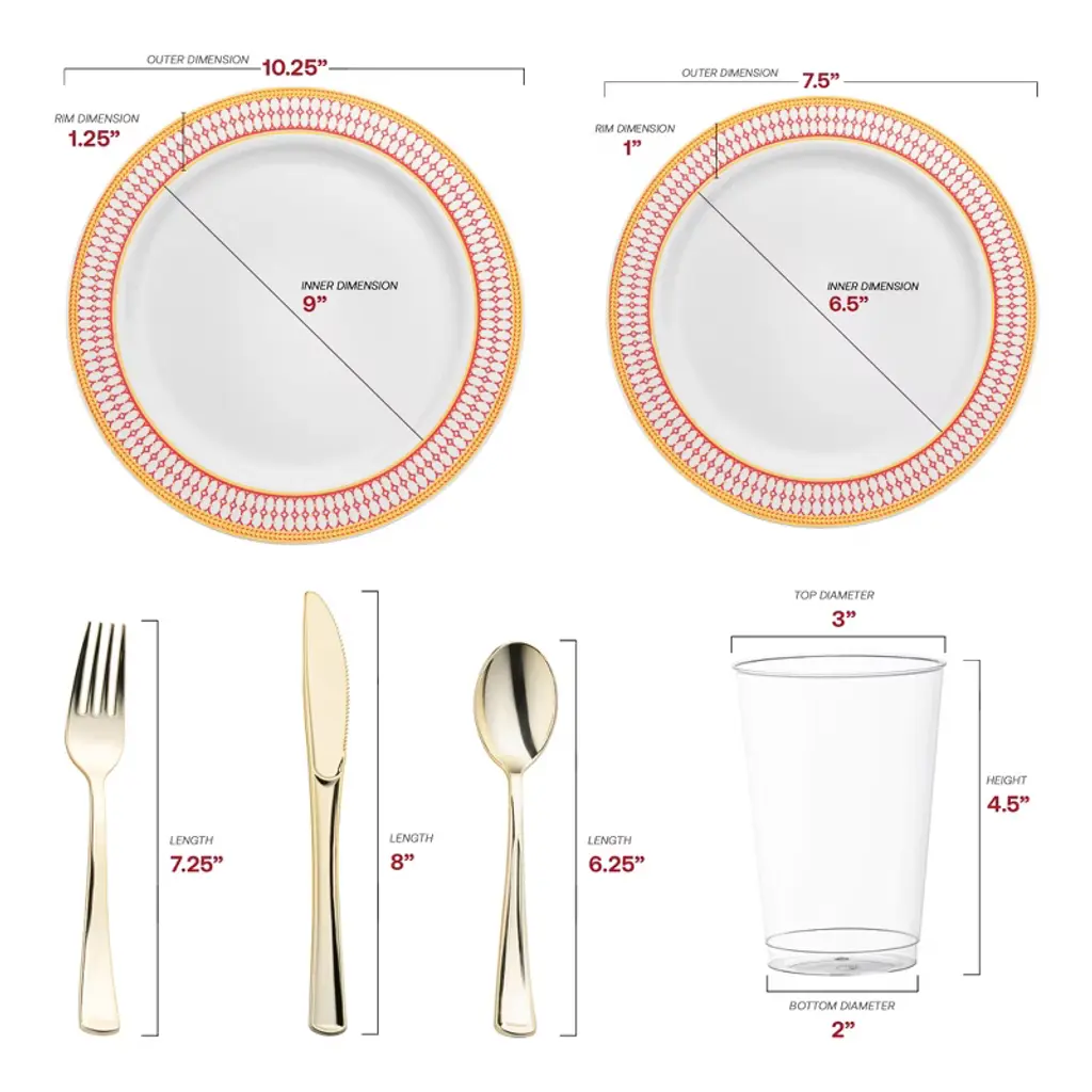 Captivate your guests with this gorgeous disposable plastic wedding value set, a luxurious ensemble designed to elevate your special day. This expansive collection features 120 dinner plates, 120 salad plates, 120 forks, 120 spoons, 120 knives, and 120 12 oz. tumblers, ensuring every detail of your table setting radiates elegance. The pristine white hue adorned with intricate red and gold chord rim accents exudes opulence, creating a regal ambiance for your wedding or formal affair. Crafted from premium plastic, each piece combines durability with refined aesthetics, guaranteeing a memorable dining experience that reflects your impeccable taste and style.