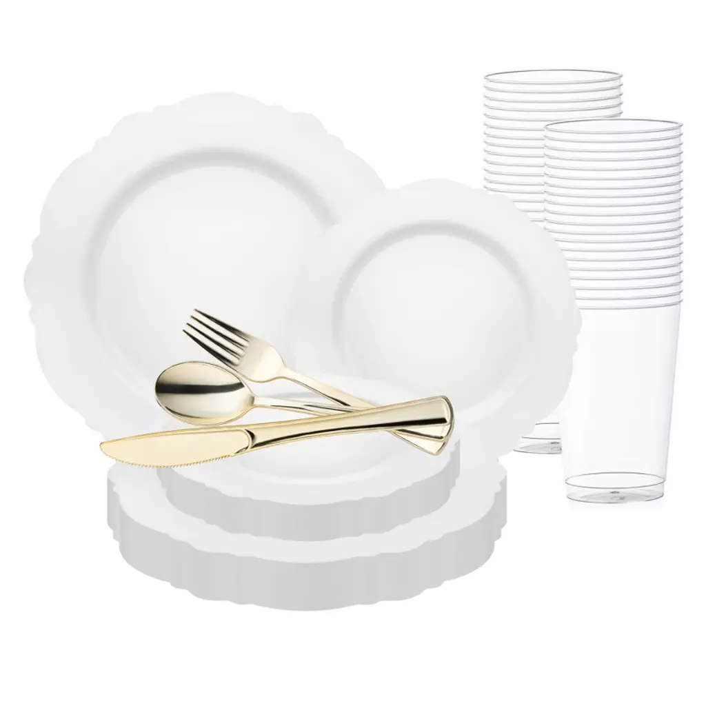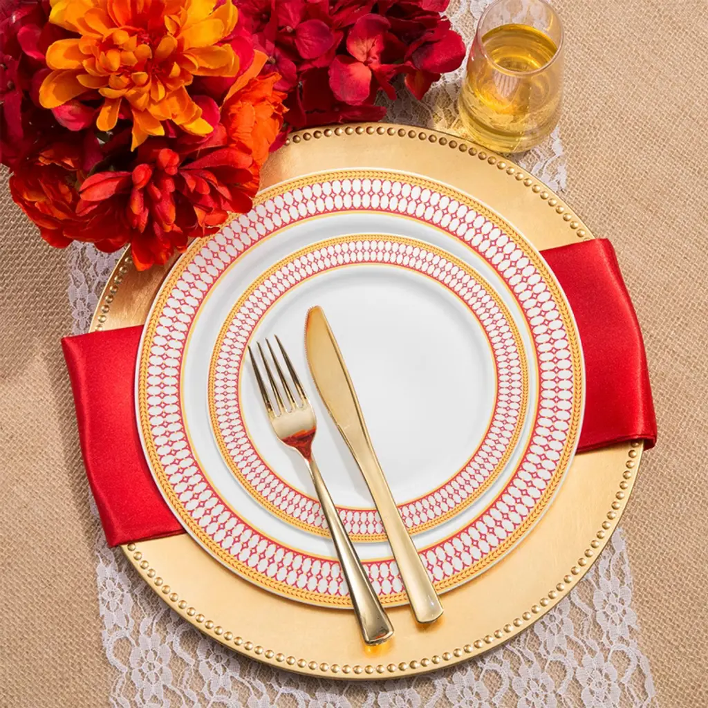 Exemplifying opulence and elegance, this modern disposable plastic wedding value set offers a seamless blend of sophistication and convenience. This comprehensive set includes 60 dinner plates, 60 salad plates, 60 forks, 60 spoons, 60 knives, and 60 12 oz. tumblers, ensuring every aspect of your table setting exudes refinement. The striking combination of white with red and gold chord rim detailing adds a touch of regal charm to any wedding or formal event. Crafted from high-quality plastic, each piece combines durability with exquisite design, guaranteeing a memorable dining experience for you and your guests.