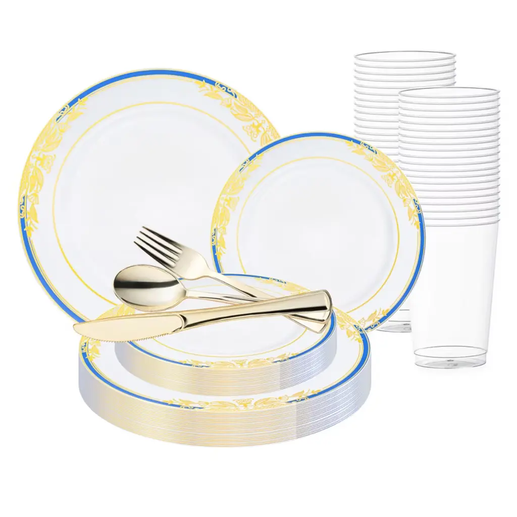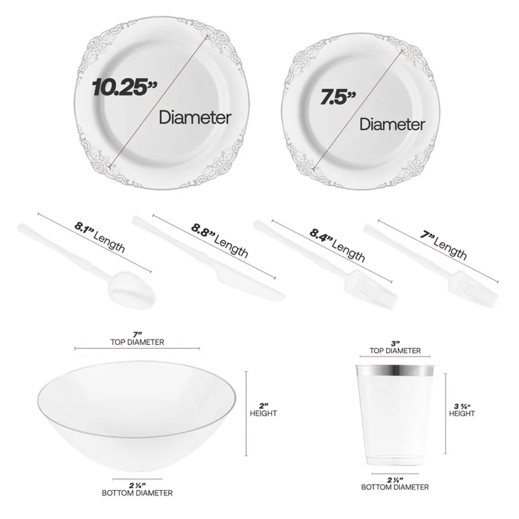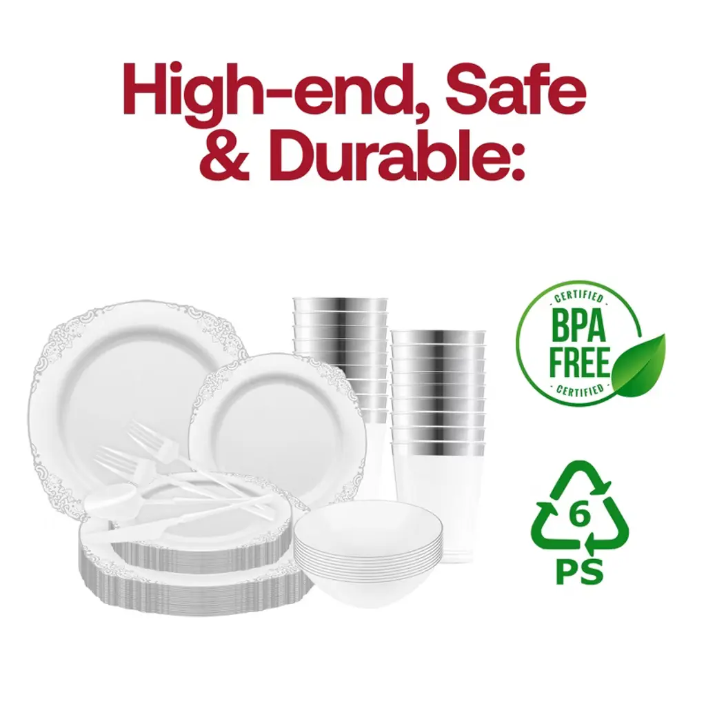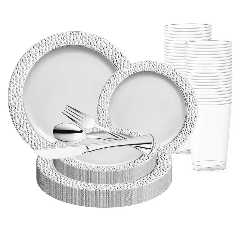 Elevate your event with the White & Silver Fancy Tableware Set—sophisticated, disposable, and ideal for weddings or formal celebrations!