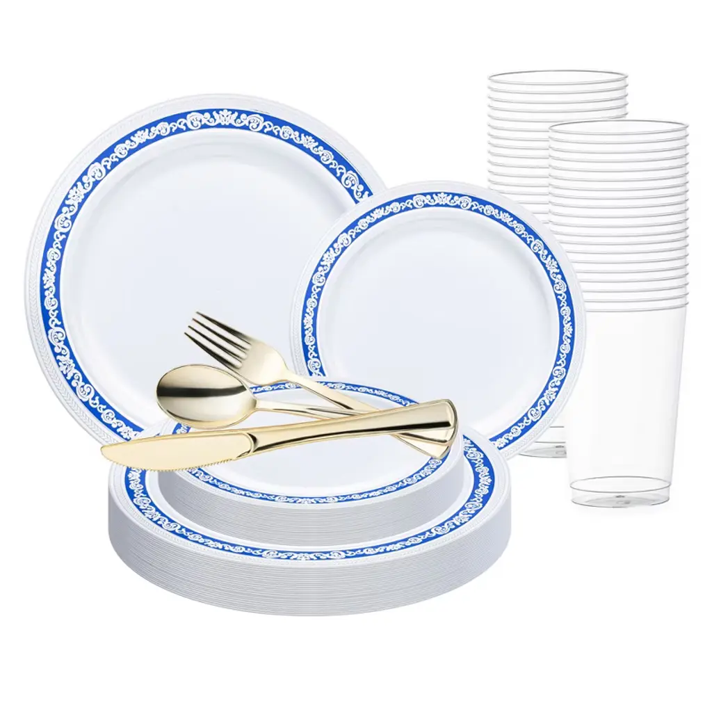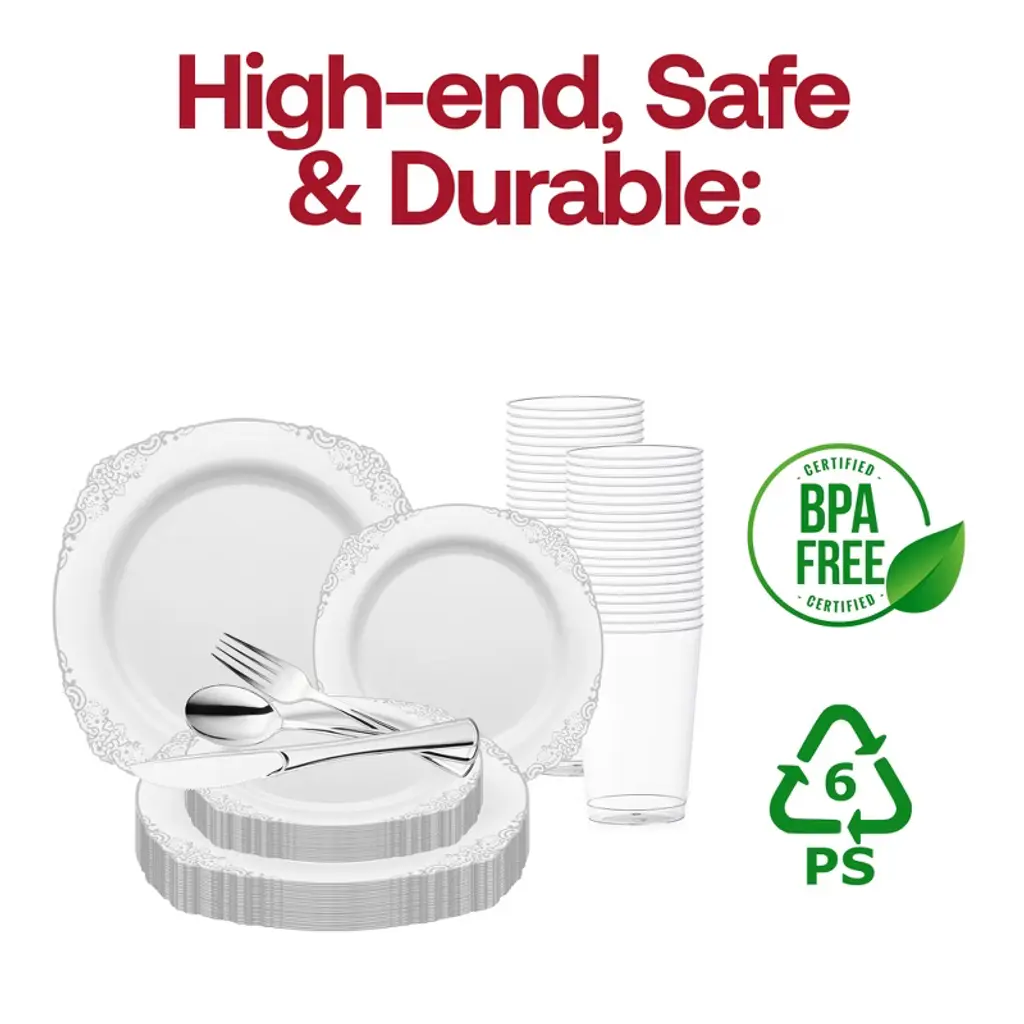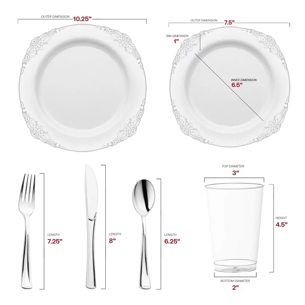 Choose our Fancy White with Silver Disposable Wedding Value Set. Perfect for weddings and formal events. Buy now for the lowest price!