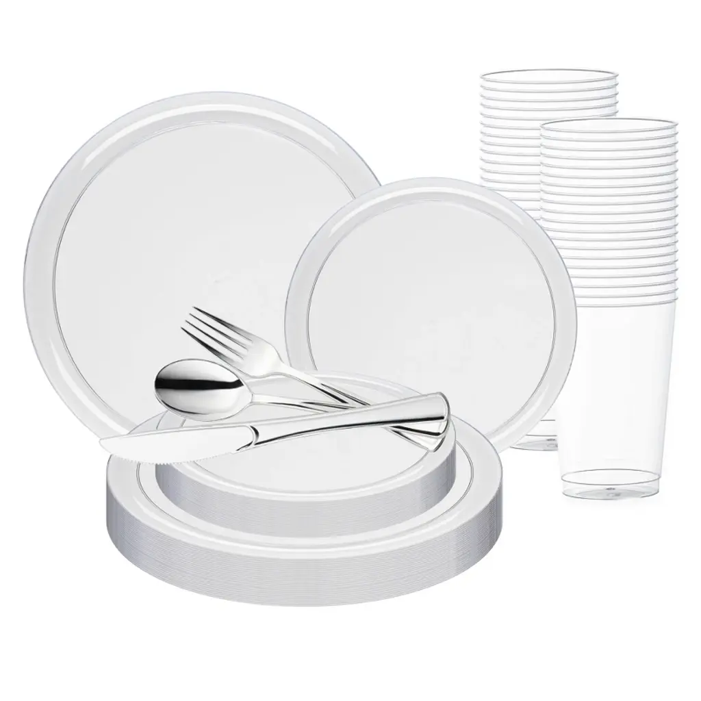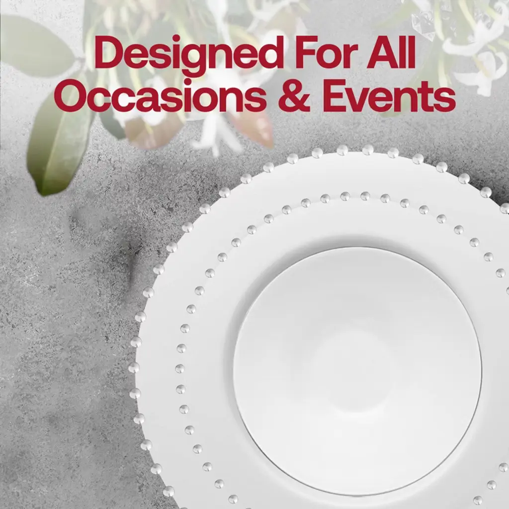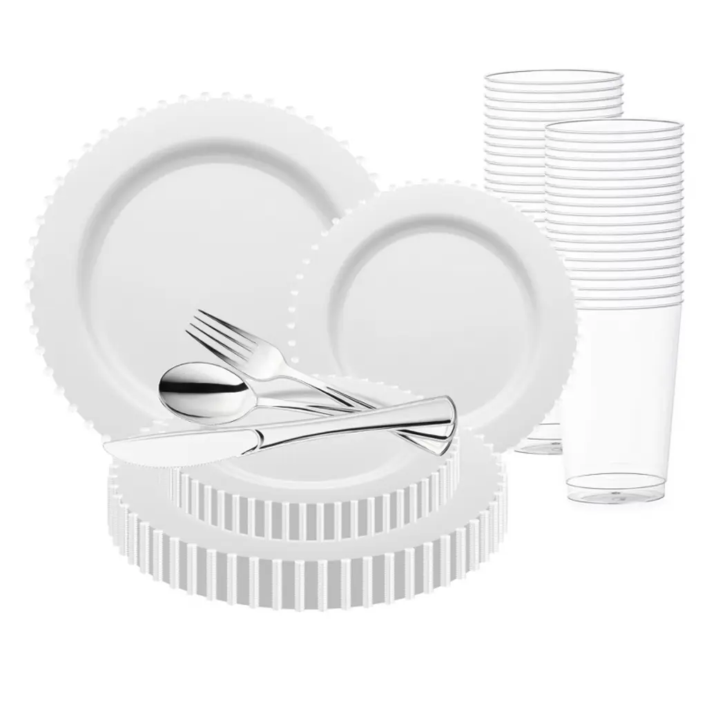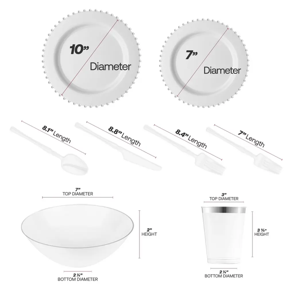 Add timeless elegance with the White & Silver Pearl String Tableware Set—durable, disposable, and perfect for sophisticated events!