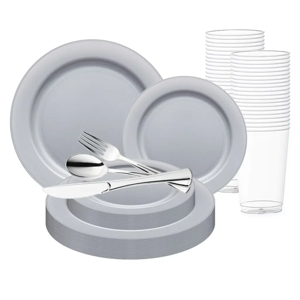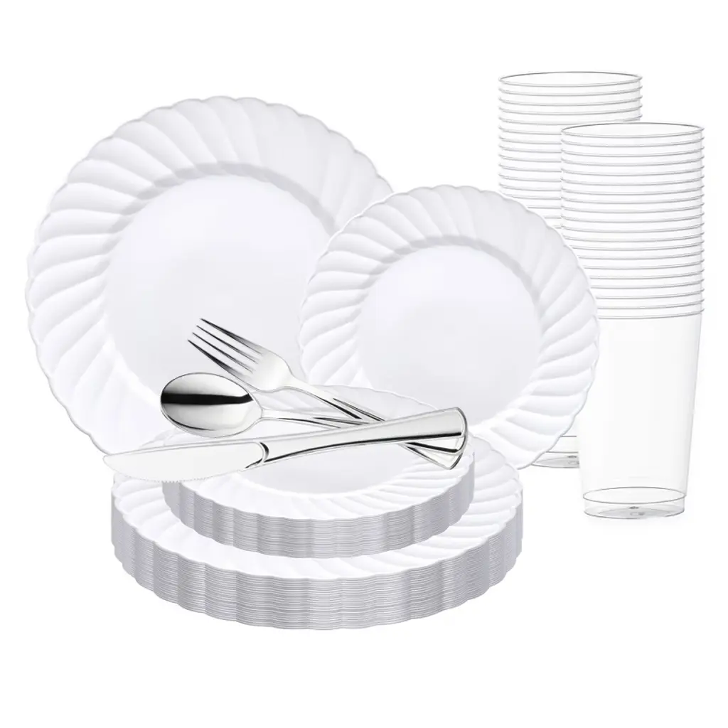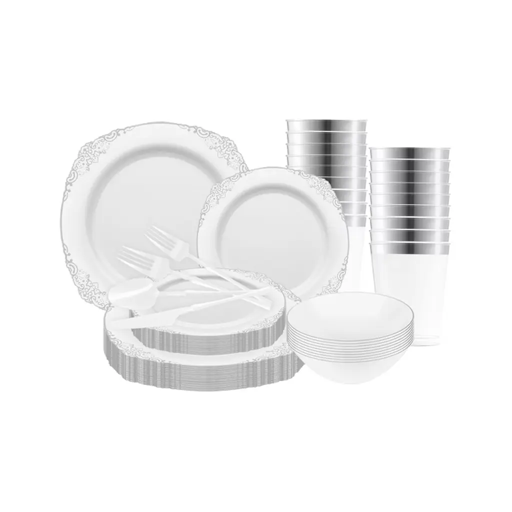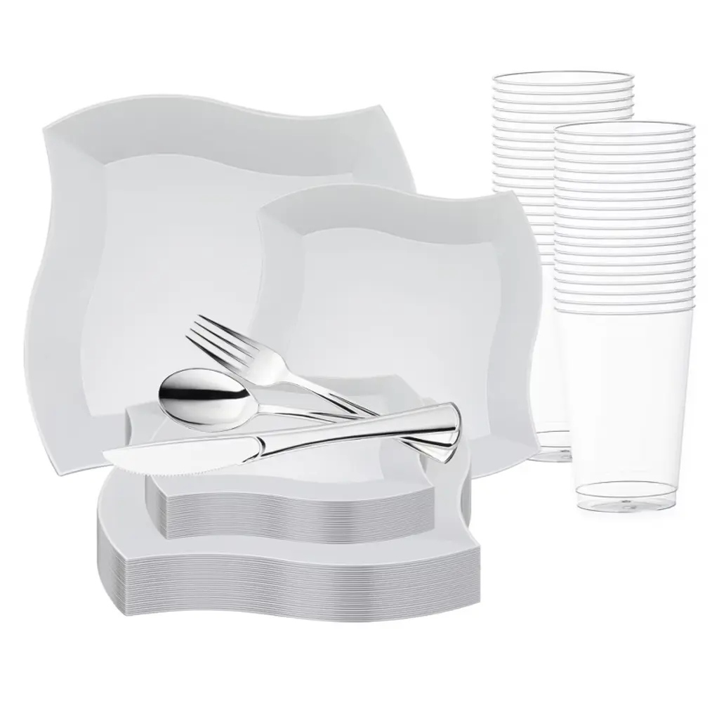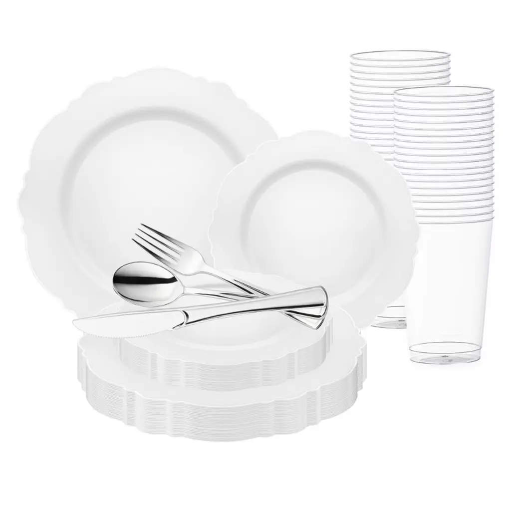 Add timeless elegance with the White & Silver Pearl String Tableware Set—durable, disposable, and perfect for sophisticated events!