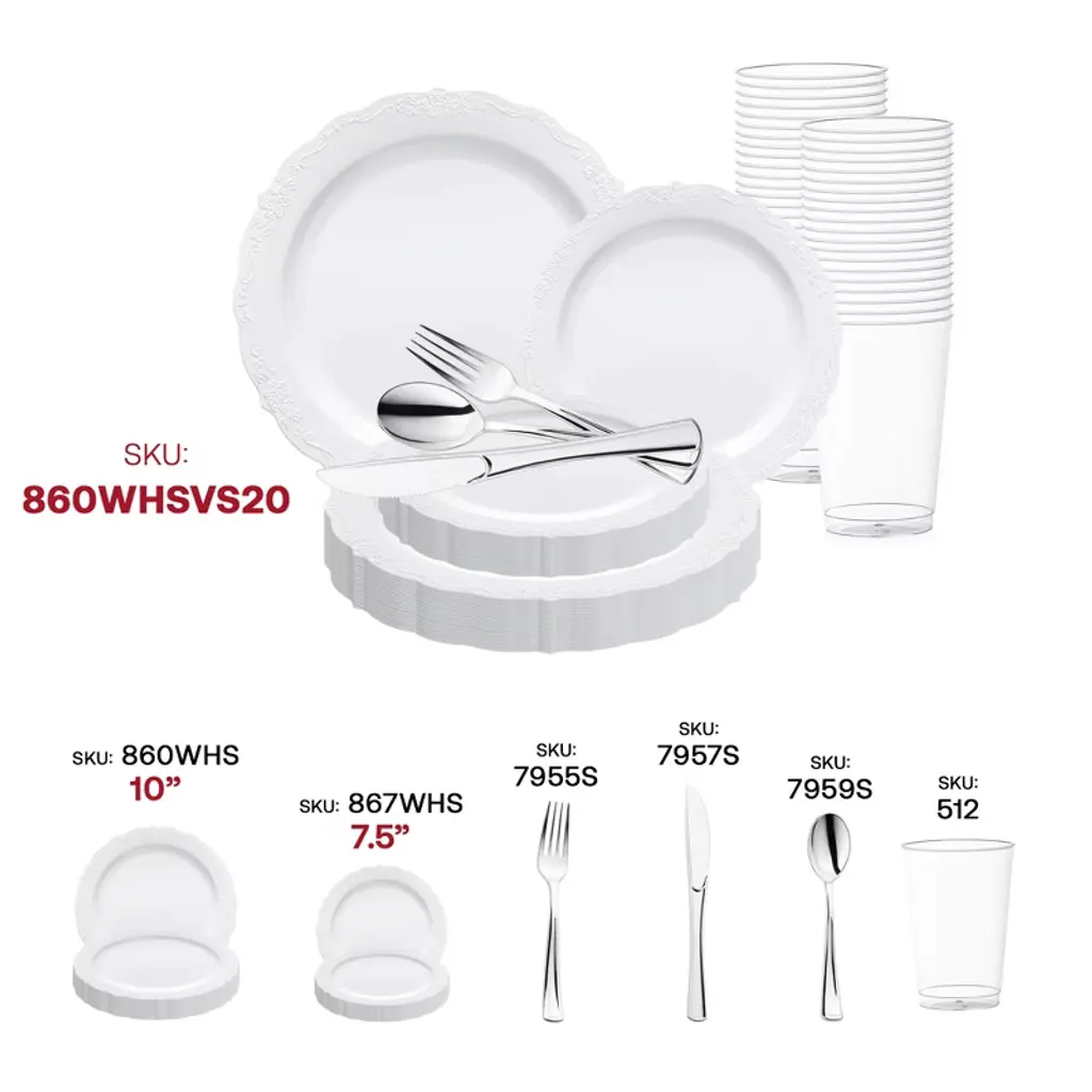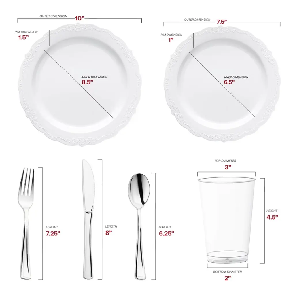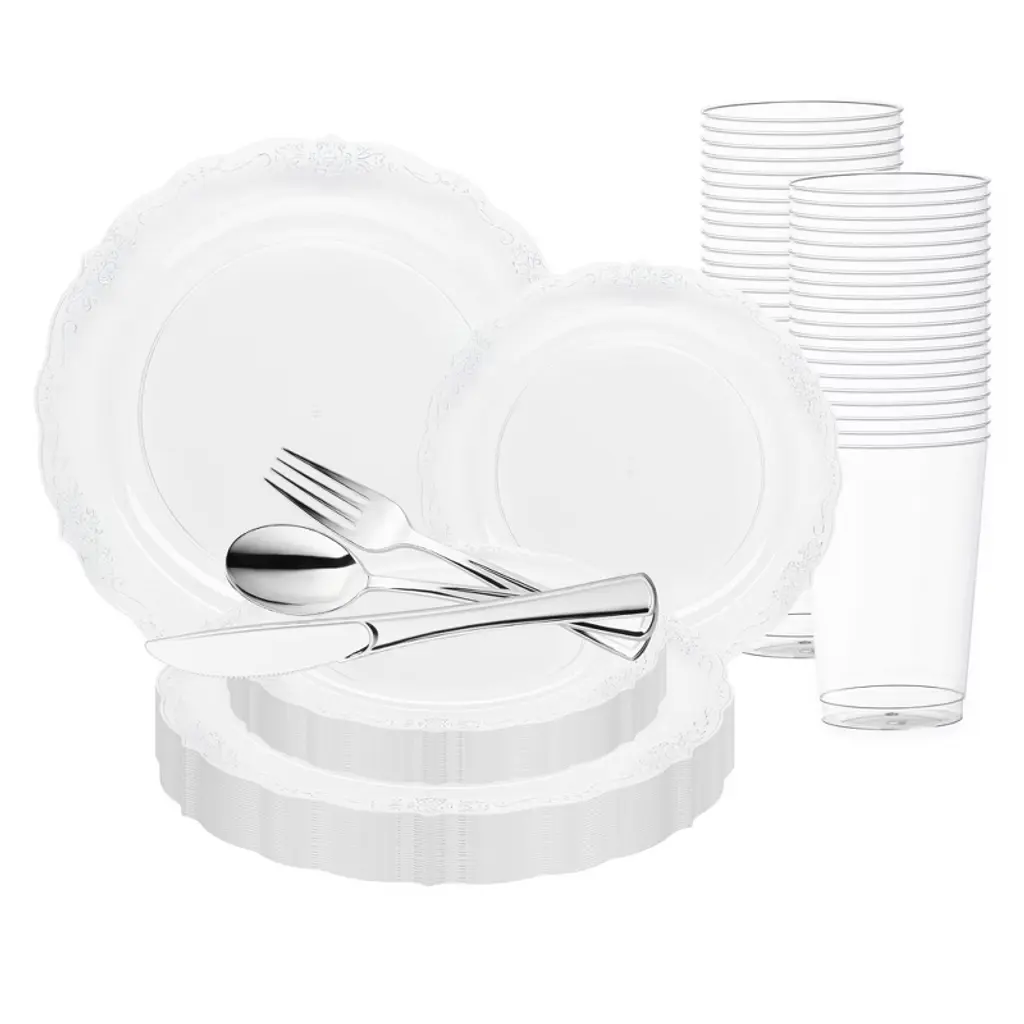 This luxurious disposable plastic tableware value set will transform your wedding reception into an affair of timeless elegance. This expansive collection features 120 dinner plates, 120 salad plates, 120 forks, 120 spoons, 120 knives, and 120 12 oz. tumblers, ensuring seamless coordination and ample supplies for your guests. This disposable set boasts a pristine white design accented by a refined silver vintage rim, exuding sophistication and charm. Crafted from durable plastic, this set combines style with convenience, allowing you to focus on creating unforgettable memories without worrying about cleanup. Elevate your special day with this exquisite ensemble, where every detail reflects impeccable taste and luxury.