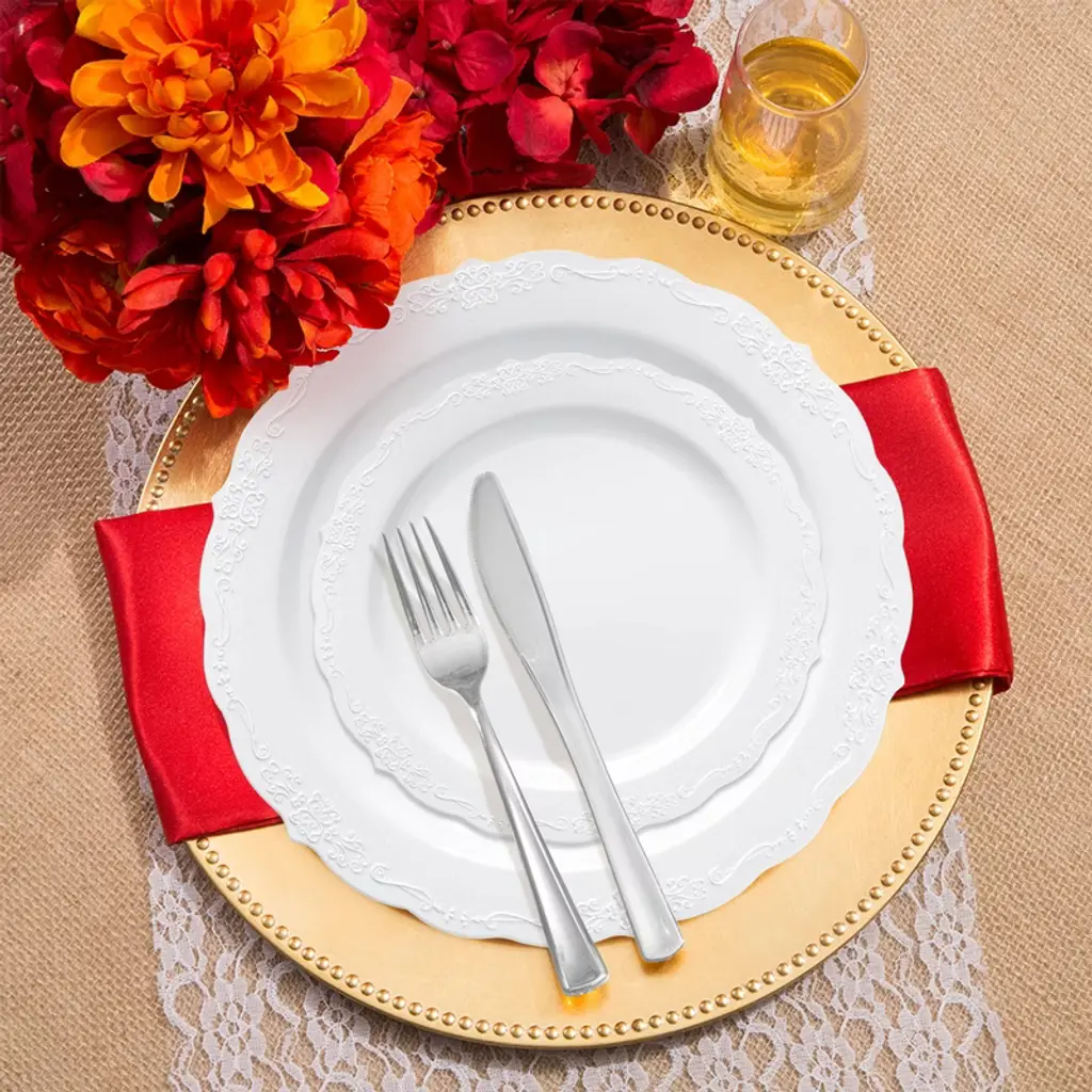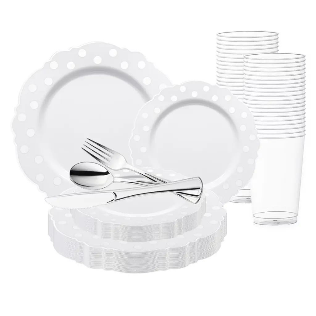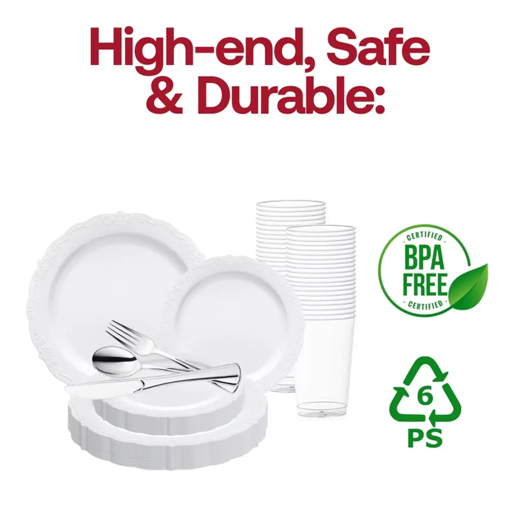 This luxurious disposable plastic tableware value set will transform your wedding reception into an affair of timeless elegance. This expansive collection features 120 dinner plates, 120 salad plates, 120 forks, 120 spoons, 120 knives, and 120 12 oz. tumblers, ensuring seamless coordination and ample supplies for your guests. This disposable set boasts a pristine white design accented by a refined silver vintage rim, exuding sophistication and charm. Crafted from durable plastic, this set combines style with convenience, allowing you to focus on creating unforgettable memories without worrying about cleanup. Elevate your special day with this exquisite ensemble, where every detail reflects impeccable taste and luxury.