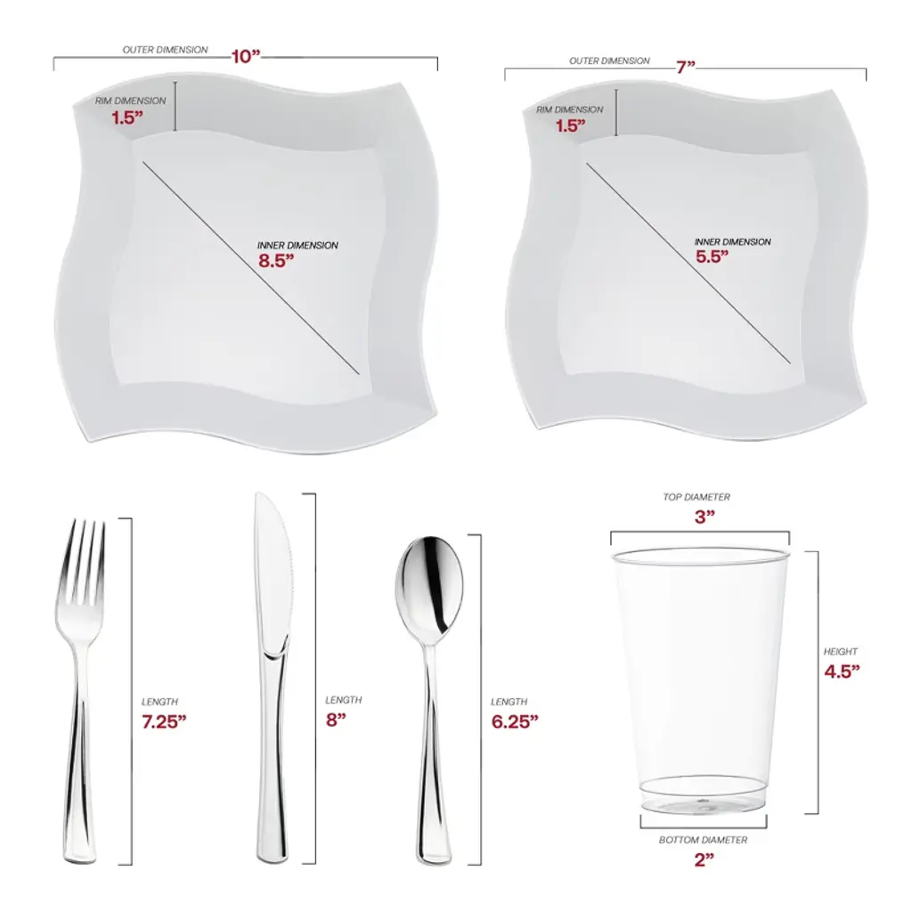 Add a touch of modern elegance to your special day with this fashionable disposable plastic tableware value set. This set includes 60 dinner plates and 60 salad plates, featuring a unique wave design that adds texture and sophistication to your table setting. Accompanying these are 60 forks, 60 spoons, and 60 knives, each crafted with precision for both style and functionality. Complete your dining experience with 60 12 oz. tumblers, offering convenience without compromising aesthetic appeal. Whether for an intimate gathering or a grand celebration, this plastic set promises to elevate the ambiance of your wedding with its contemporary charm and versatility.