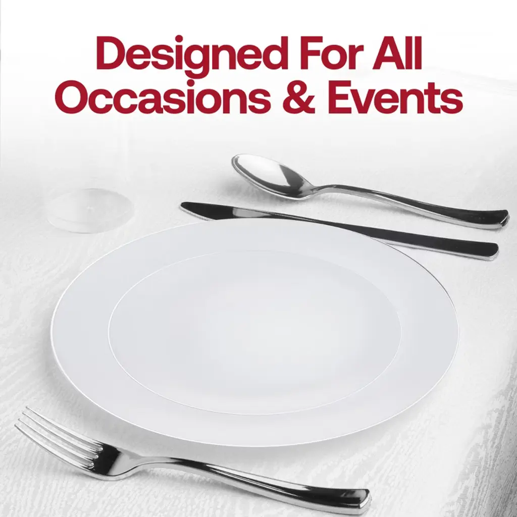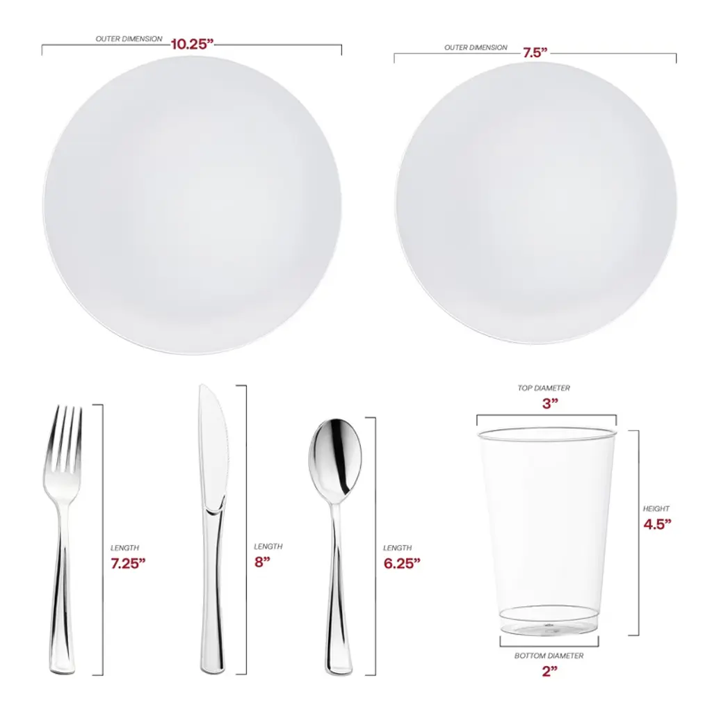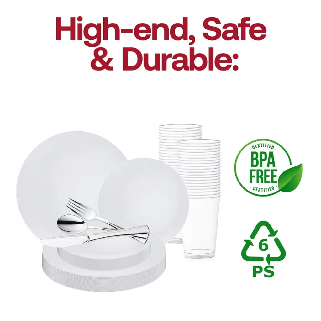 Choose our White with Silver Rim Organic Disposable Plastic Wedding Set. Get bulk purchase pricing and create an elegant, eco-friendly event. Buy now!