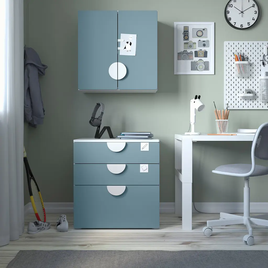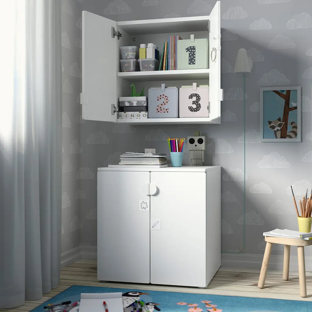 SMÅSTAD Wall cabinet - white blue/with 1 shelf 23 5/8x12 5/8x23 5/8 ". A practical and dust-free way to store small and large things – or to hide the chaos that often arises when it comes to children’s things. The doors have soft-closing hinges which make them close softly and quietly.