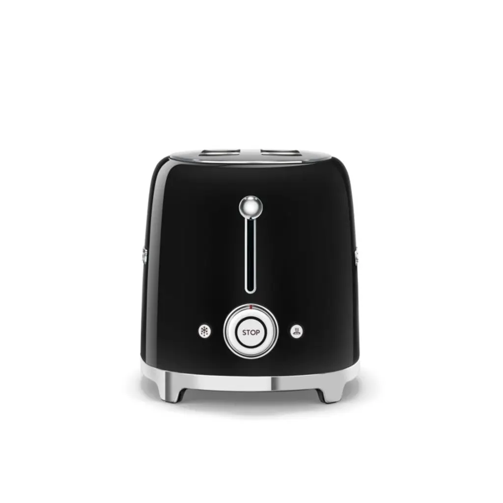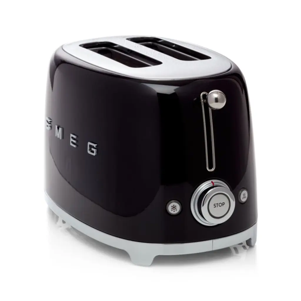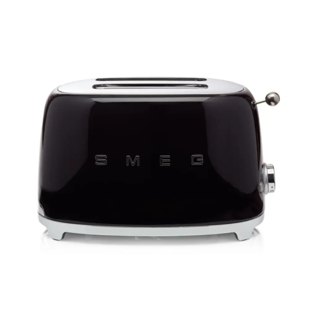 Enameled in black and accented with a charming ball lever knob, this retro two-slice toaster browns bread, bagels and more at six levels with three convenient pre-set programs. Two extra-wide slots accommodate different slice widths, and self-centering racks ensure even toasting.Known for its wonderfully retro refrigerators, SMEG has launched a joyfully designed retro kitchen appliance collection based on the curved and compact lines of postwar design. Smeg's nod to the past is the star of today's kitchen, incorporating all the current advances in technology.