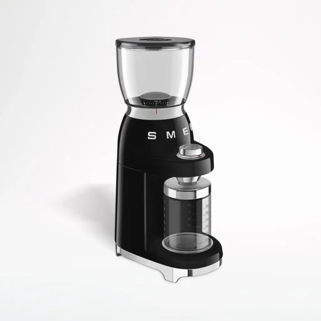 Grind coffee beans exactly to your liking with this charming black coffee grinder, which brings 1950s-inspired style to your countertop or coffee cart. Stainless steel burrs and 30 grinding levels ensure optimal flavor release from your favorite beans.Known for its wonderfully retro refrigerators, SMEG has launched a joyfully designed kitchen appliance collection based on the curved and compact lines of postwar design. SMEG's nod to the past is the star of today's kitchen, updated with all the current advances in technology.