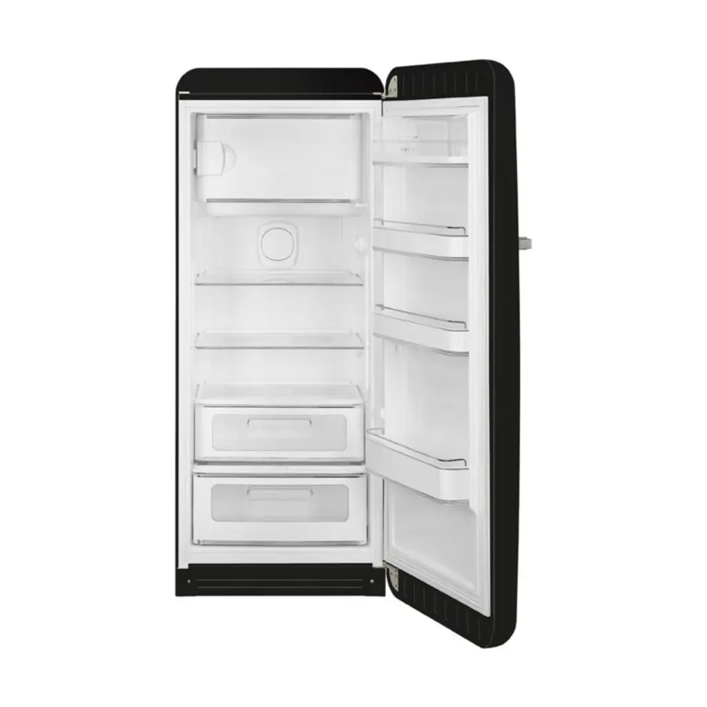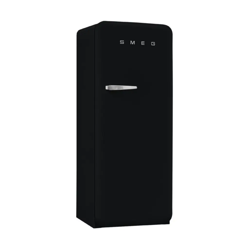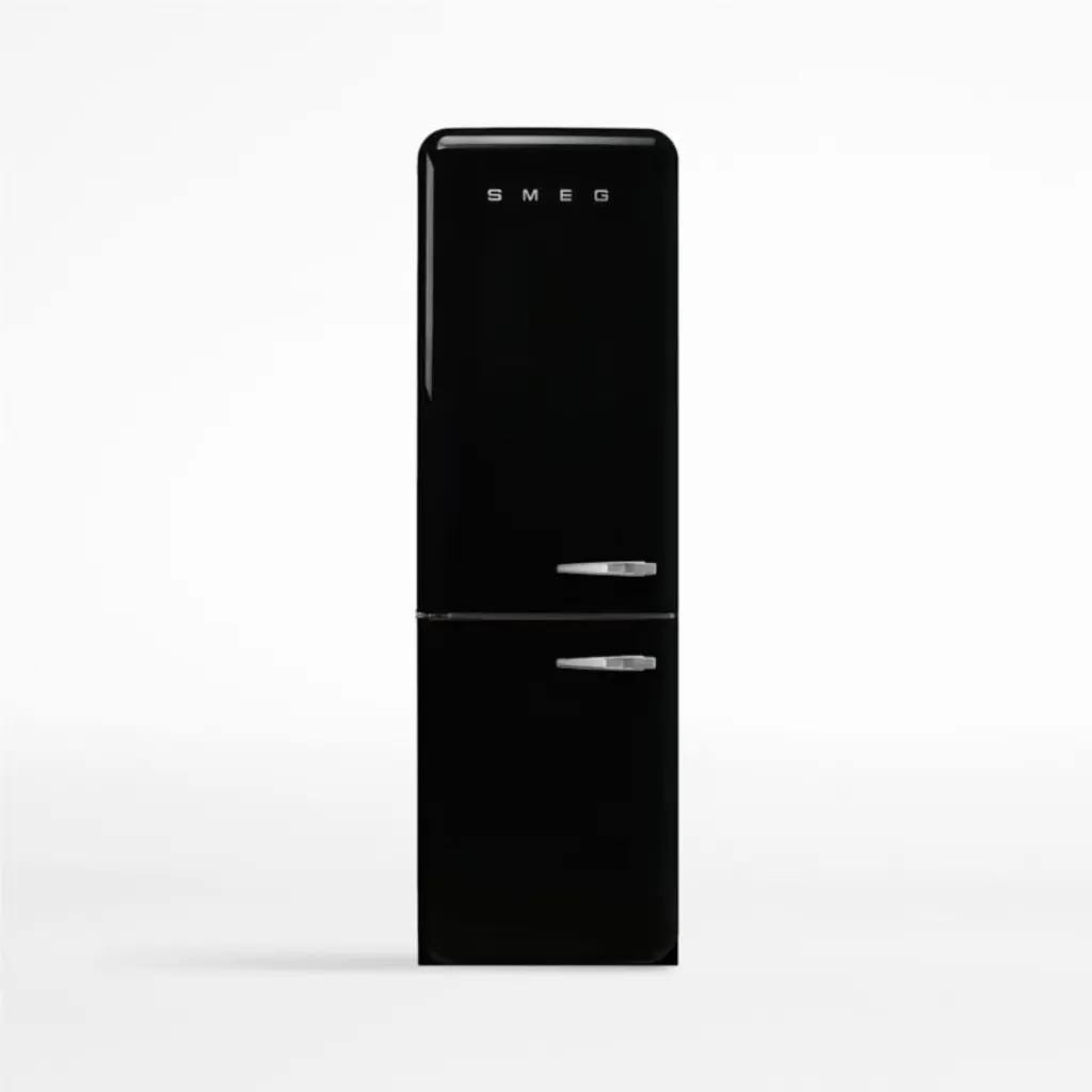 Inspired by classic mid-century appliances, the SMEG refrigerator brings a charming retro design to the contemporary kitchen. The delightfully throwback refrigerator features rounded corners, a matte black exterior and chrome accents. Inside, the modern-minded appliance opens to a compact inner freezer compartment and a flexible interior with adjustable glass shelves, produce drawers and multiple in-door bins. Designed to make efficient use of kitchen space, the freestanding refrigerator looks great at any angle with a sleek single door that opens to the right to accommodate your kitchen layout.