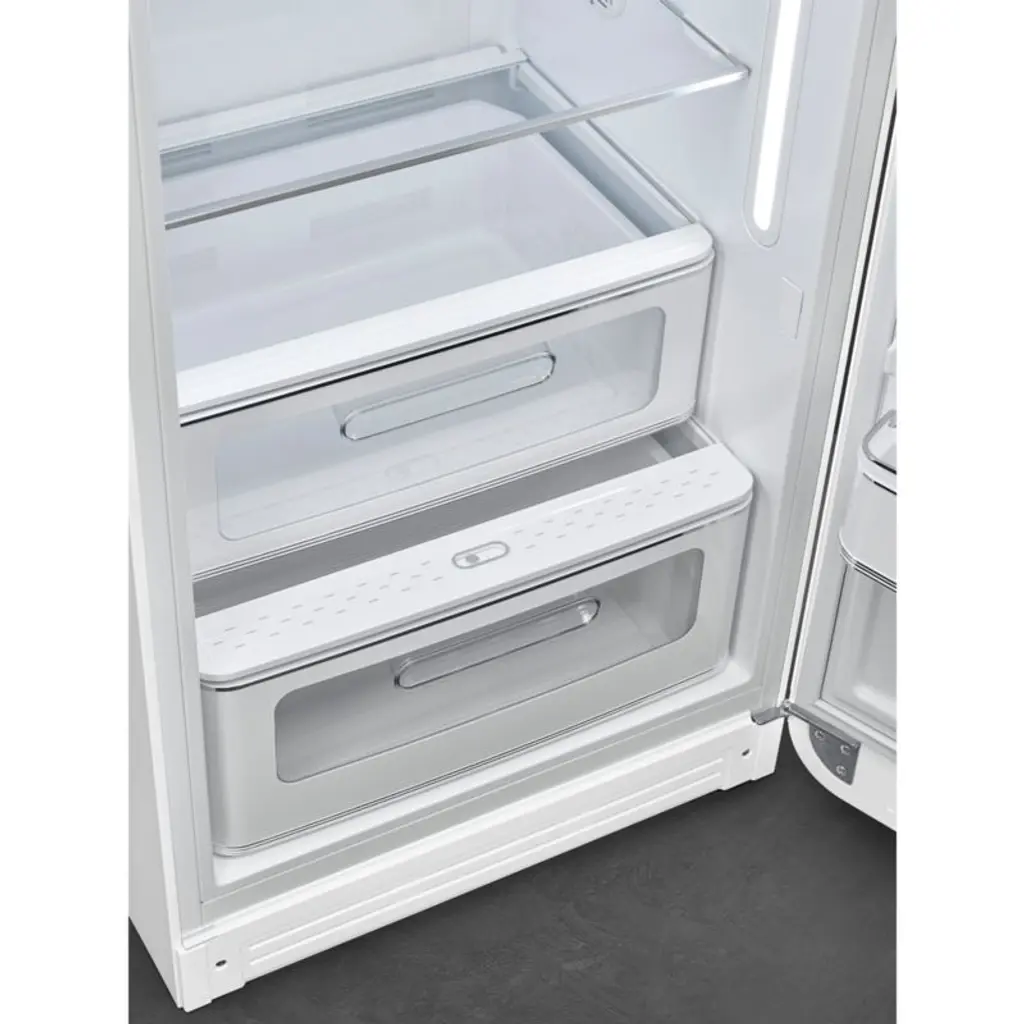 Inspired by classic mid-century appliances, the SMEG refrigerator brings a charming retro design to the contemporary kitchen. The delightfully throwback refrigerator features rounded corners, a glossy white exterior and chrome accents. Inside, the modern-minded appliance opens to a compact inner freezer compartment and a flexible interior with adjustable glass shelves, produce drawers and multiple in-door bins. Designed to make efficient use of kitchen space, the freestanding refrigerator looks great at any angle with a sleek single door that opens to the left to accommodate your kitchen layout.