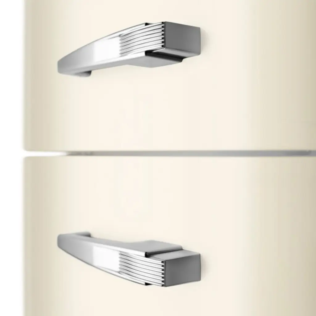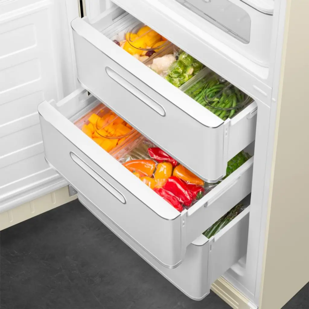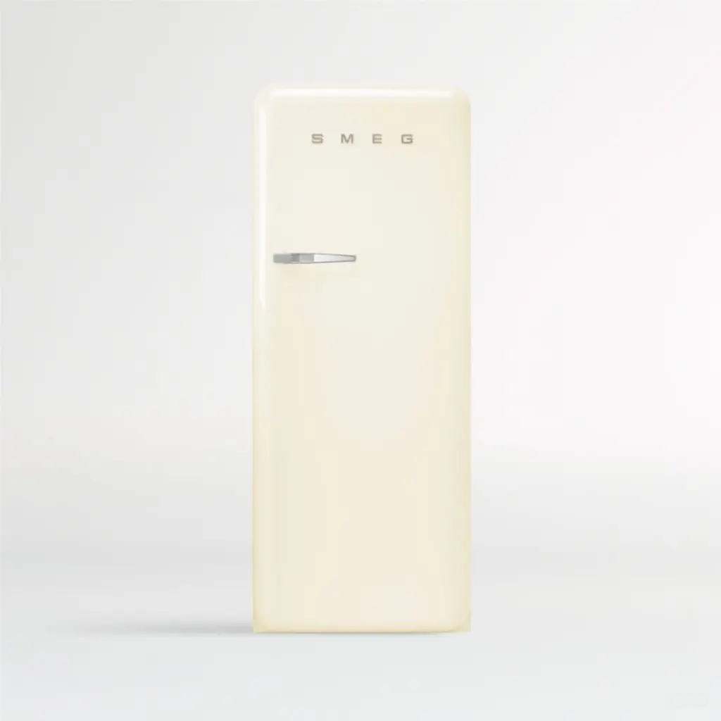 Inspired by classic mid-century appliances, the SMEG refrigerator brings a charming retro design to the contemporary kitchen. The delightfully throwback refrigerator features rounded corners, a glossy cream-colored exterior and chrome accents. Inside, the refrigerator door opens two adjustable glass shelves, three adjustable in-door bins and produce drawer and cooler drawers with sliding glass covers. The bottom freezer is frost free and features three drawers. Designed to make efficient use of kitchen space, the freestanding refrigerator looks great at any angle with doors that open to the right to accommodate your kitchen layout.