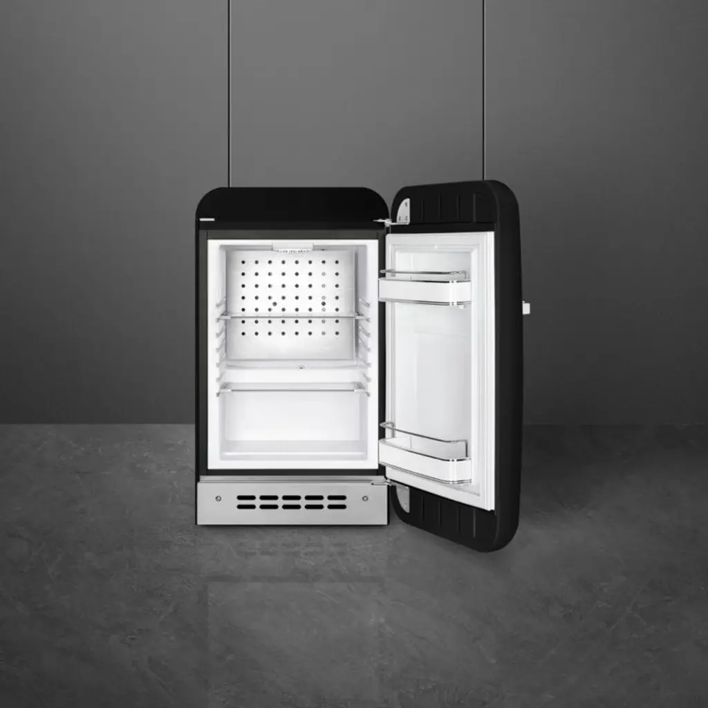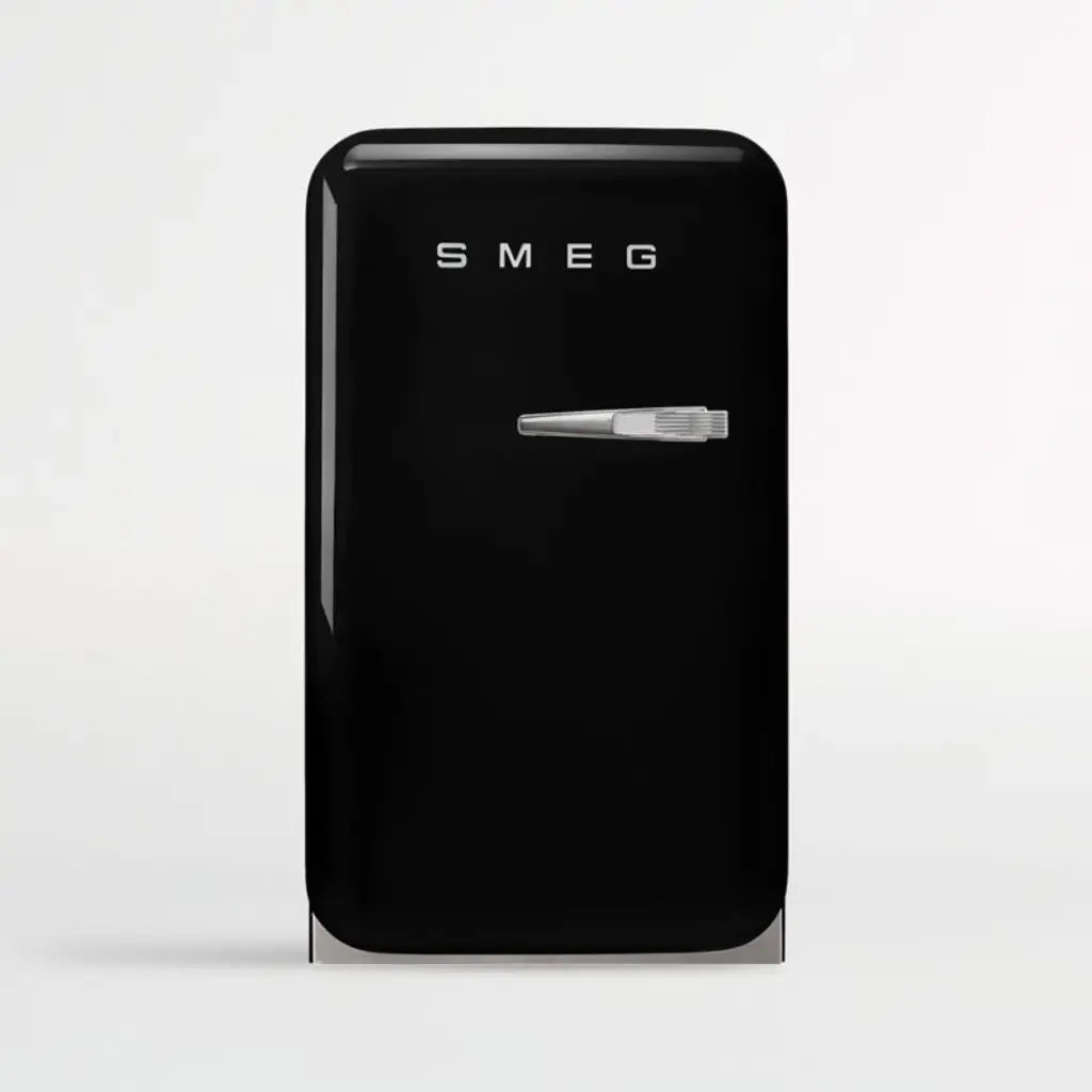 Inspired by classic mid-century appliances, this mini version of the popular SMEG refrigerator brings its retro charm to dorm rooms, home bars, garages and studio apartments. The delightfully throwback refrigerator features the same rounded corners and chrome accents as its larger counterpart. Inside, the glossy black appliance opens to a flexible interior with two adjustable glass shelves and two in-door bins. Designed to make efficient use of space, the freestanding refrigerator looks great at any angle with a sleek single door that opens to the right to accommodate your layout.