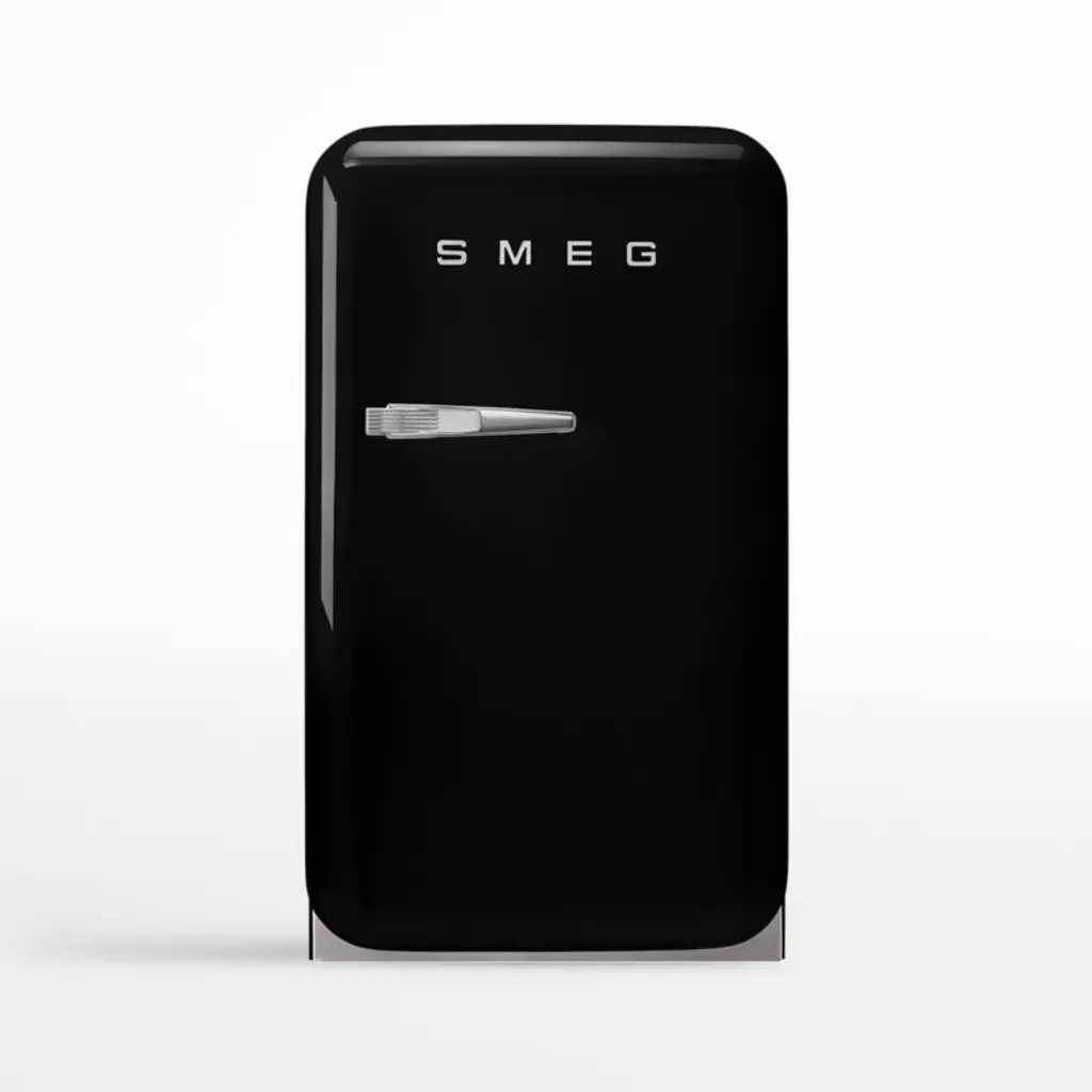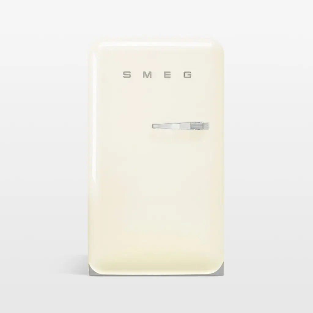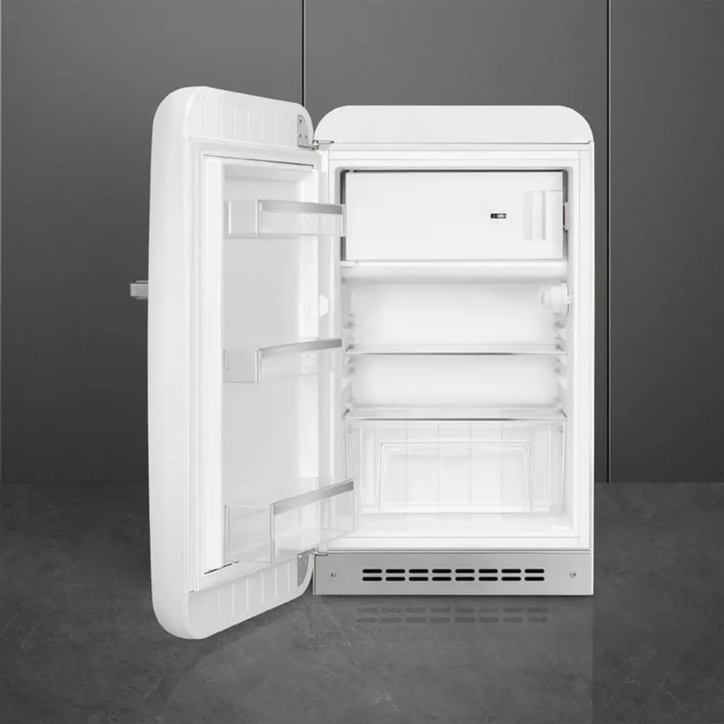 Inspired by classic mid-century appliances, SMEG refrigerators bring retro charm to the contemporary kitchen. This petite fridge features rounded corners, a glossy white exterior and chrome accents for an impeccably throwback look. The modern-minded FAB10 opens to a flexible interior with adjustable glass shelves, crisper drawer and compact inner freezer compartment. A bottle shelf and two adjustable shelves on the door add organized storage. Designed to make efficient use of limited space, the freestanding refrigerator looks great at any angle with a sleek single door that opens to the left to accommodate your floor plan.