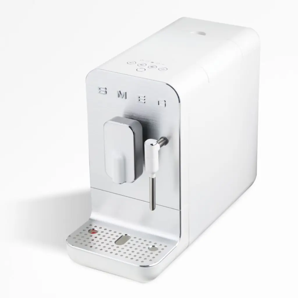 Retro style meets modern tech in our espresso maker from Smeg. With its charming rounded corners, mix of metals matte white finish made exclusively for Crate & Barrel, this machine brings delicious espresso drinks and charming style to your kitchen. Add your favorite beans to the adjustable conical burr grinder, and choose from one of the six pre-programmed beverages. If desired, use the stainless steel steam wand to create luxurious lattes, mochas and more.Known for its wonderfully retro refrigerators, SMEG has created a joyfully designed kitchen appliance collection based on the compact, curved lines of postwar design. SMEG's nod to the past is the star of today's kitchen, incorporating all the current advances in technology while celebrating vintage aesthetics.