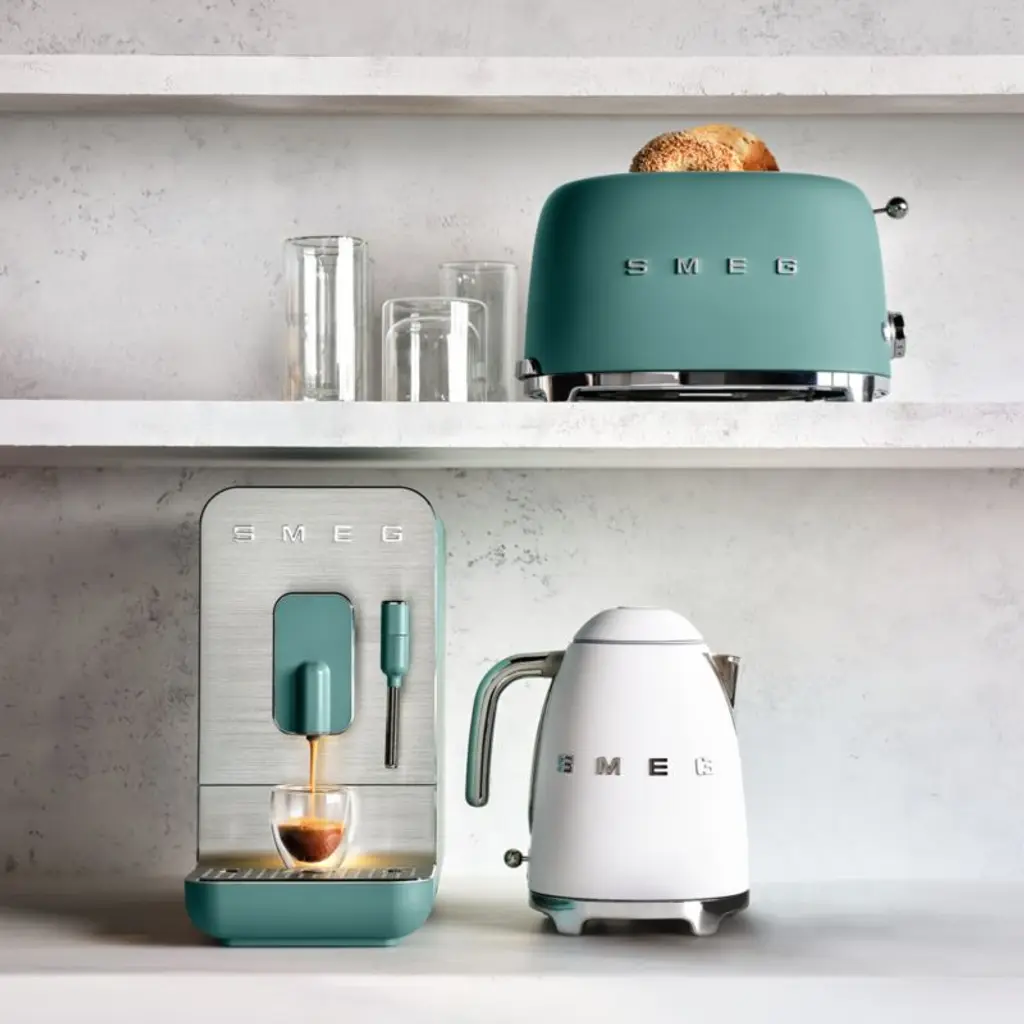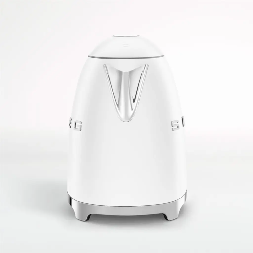 With its charming bullet shape, fun chrome metal accents and matte white finish made exclusively for us, this electric kettle goes beyond basics with a soft-opening lid to manage steam release and a swivel base that goes full circle.Known for its wonderfully retro refrigerators, SMEG has launched a joyfully designed kitchen appliance collection based on the curved and compact lines of postwar design. Incorporating a 1950s-era aesthetic, SMEG's nod to the past is the star of today's kitchen, incorporating all the current advances in technology.