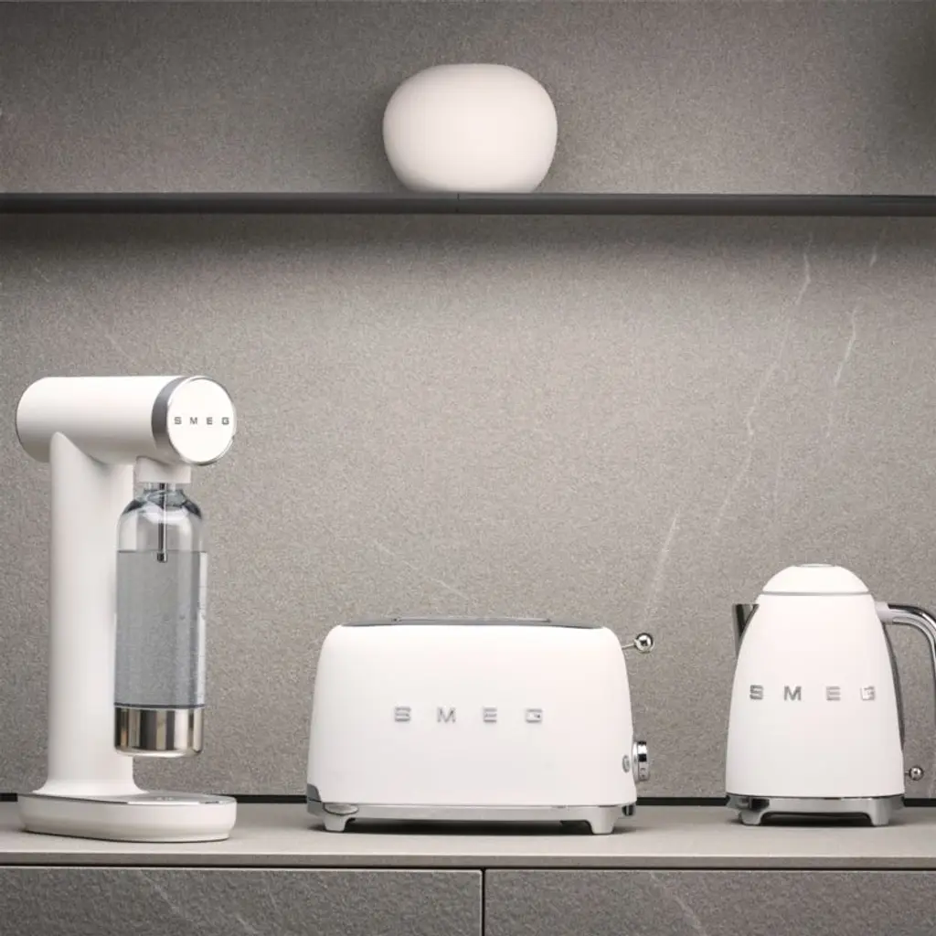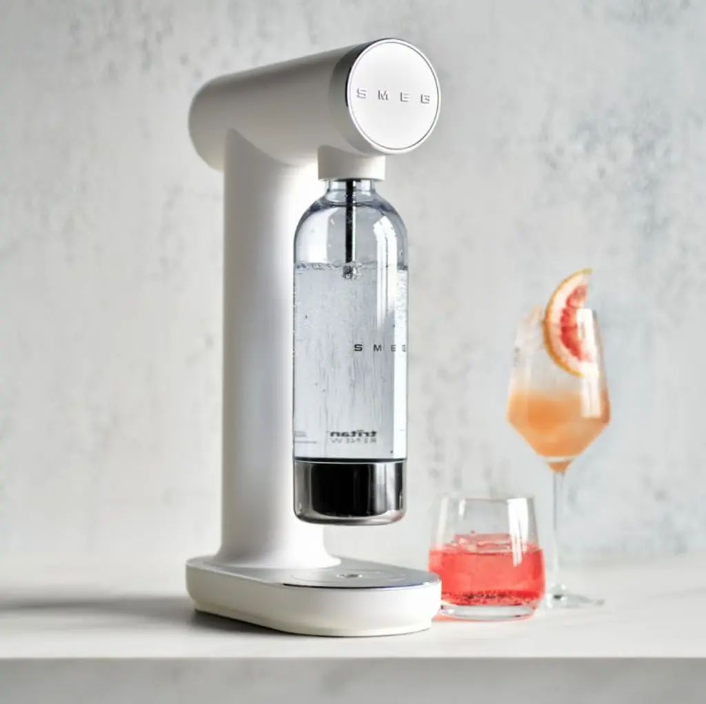 Add some fizz to daily hydration goals with sparkling water made right in your own kitchen. Featuring Smeg's signature design and innovative functionality, the appliance effortlessly carbonates still water while looking swell on the countertop. To add bubbles to your H2O simply fill the 1-liter bottle, twist it onto the machine and turn the front knob clockwise one to three times for the desired amount of carbonation.Known for its wonderfully retro refrigerators, SMEG has created a joyfully designed kitchen appliance collection based on the compact, curved lines of postwar design. SMEG's nod to the past is the star of today's kitchen, incorporating all the current advances in technology while celebrating vintage aesthetics.